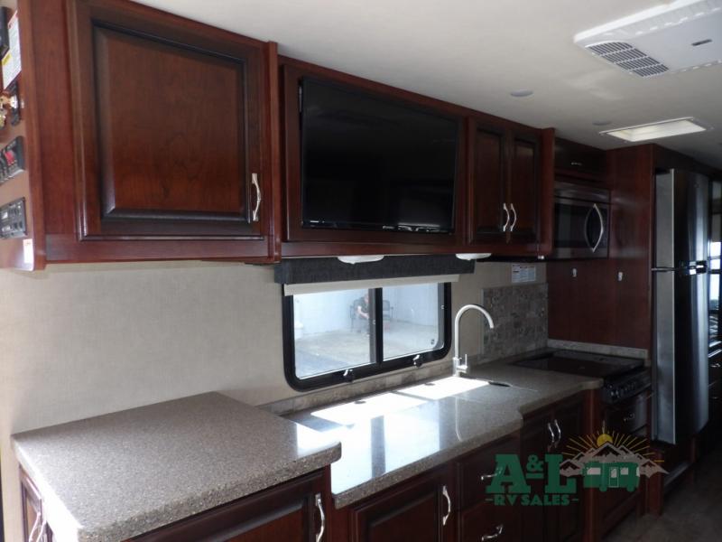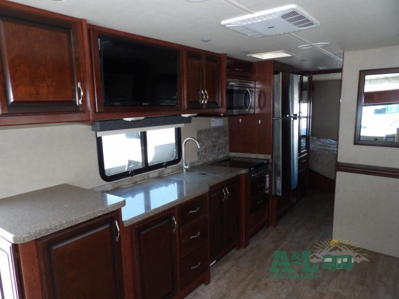 As you step inside notice the kitchen to your left which features counter space, plus a 32" LED TV overhead. There is a double sink, a three burner range with overhead microwave oven, and a refrigerator for your perishables. You will also find plenty of storage in the overhead cabinets for dishes and things.
