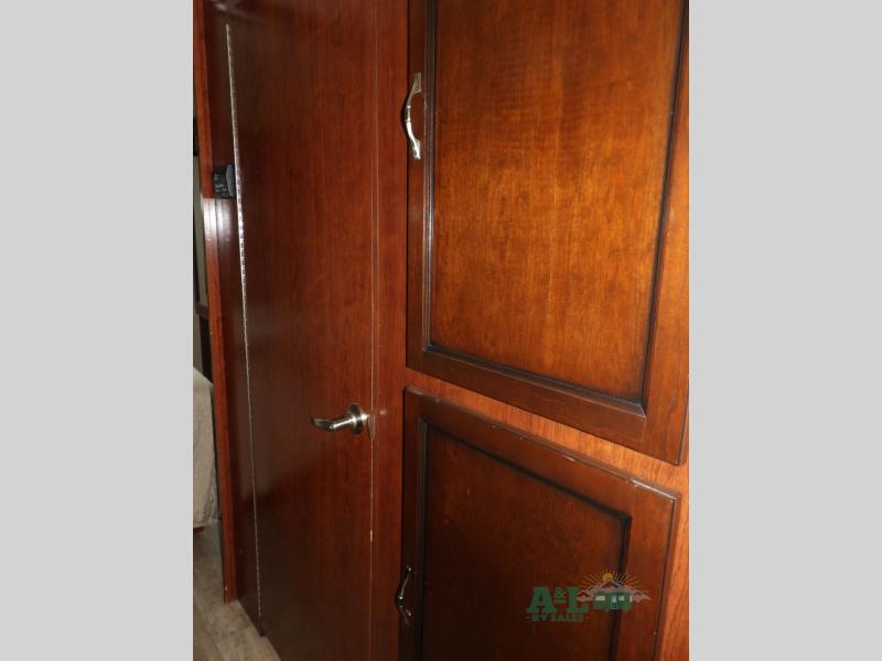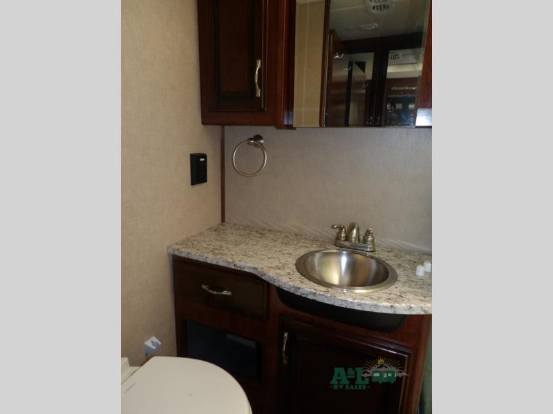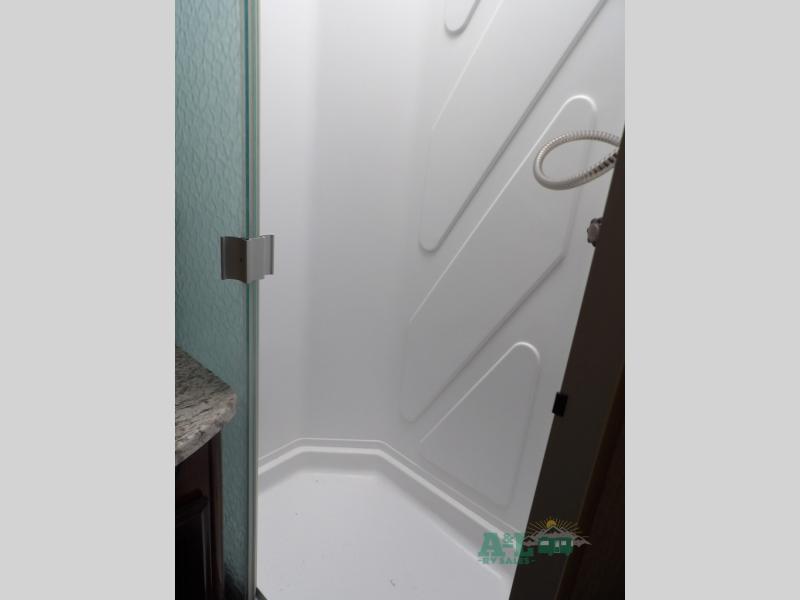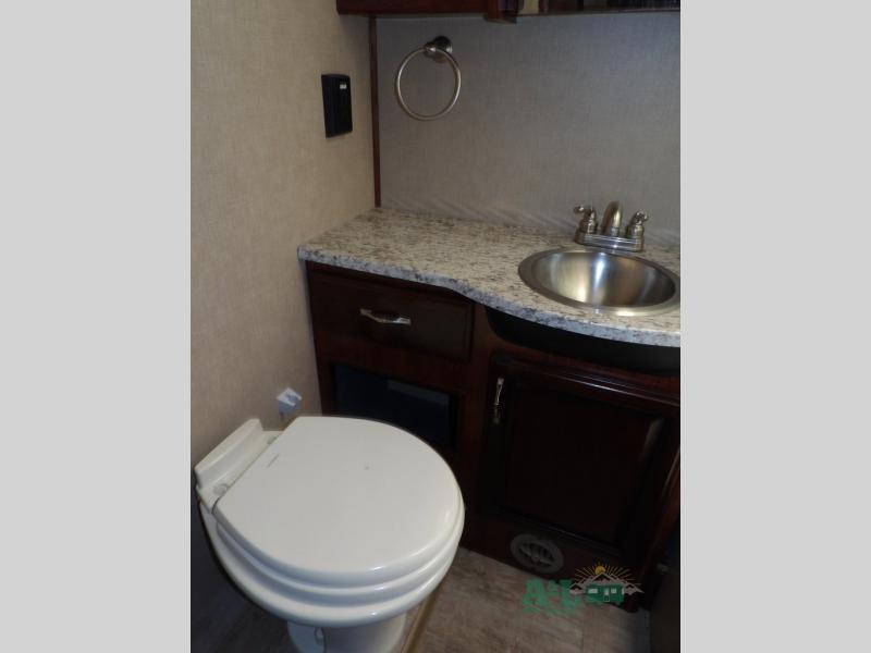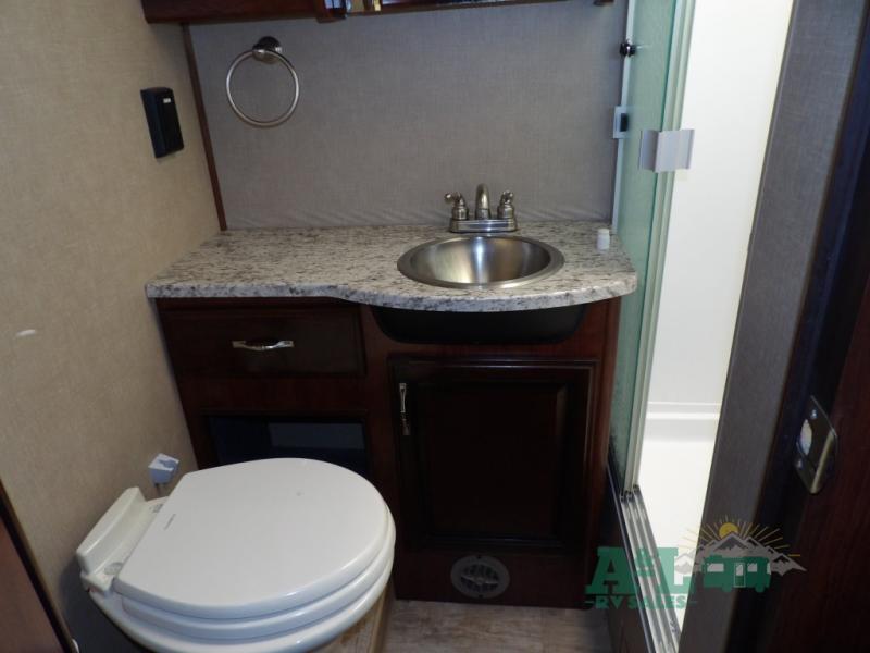 Beyond the slide out and kitchen area you have a complete bath including a shower, vanity with sink, toilet, and overhead medicine cabinet. There is also a pantry just outside the bathroom door.