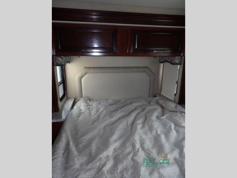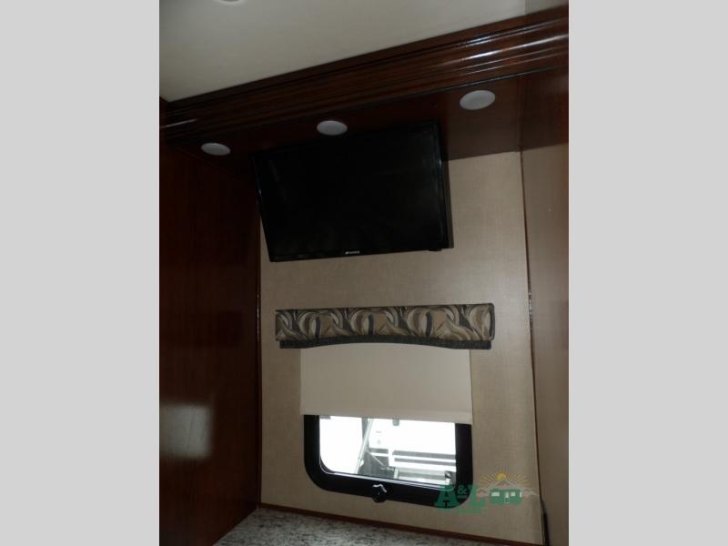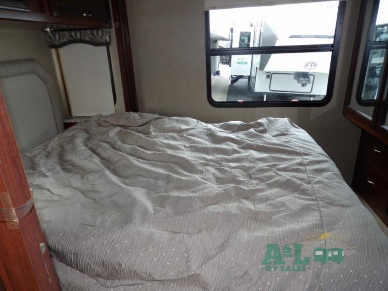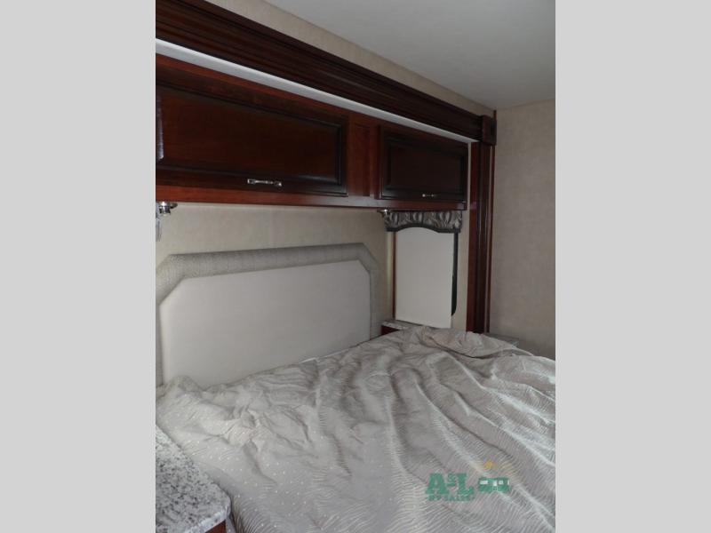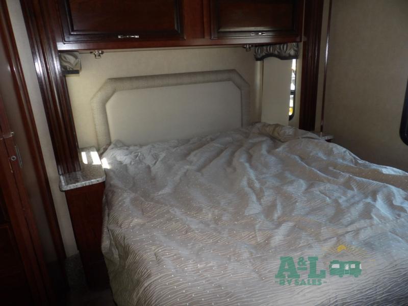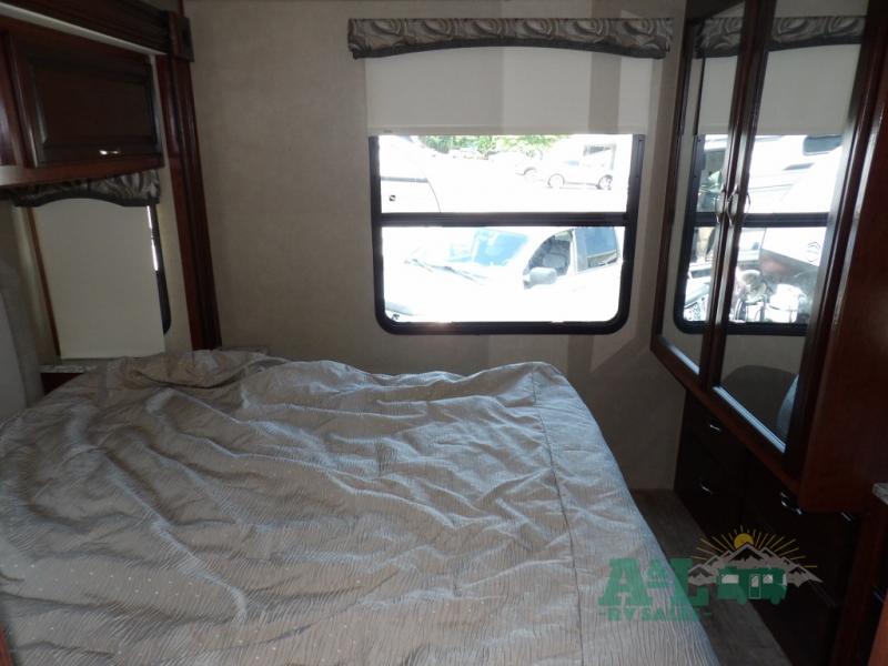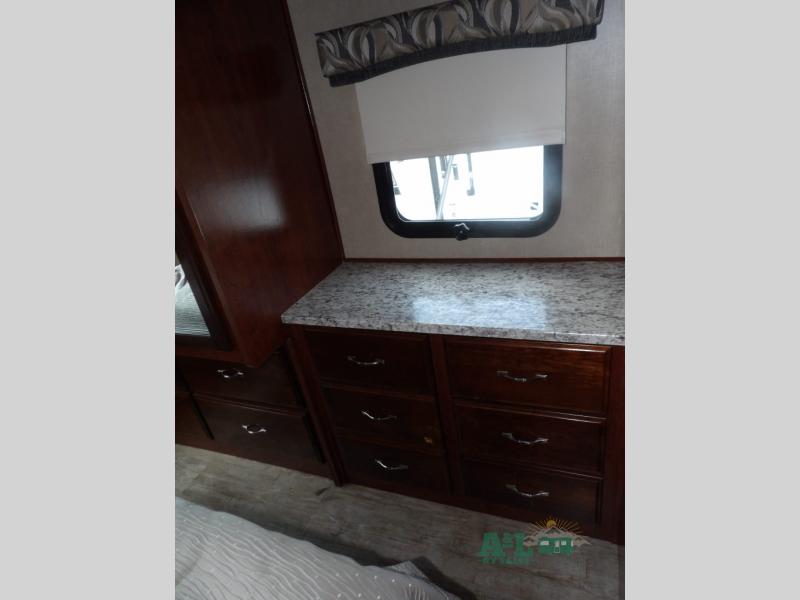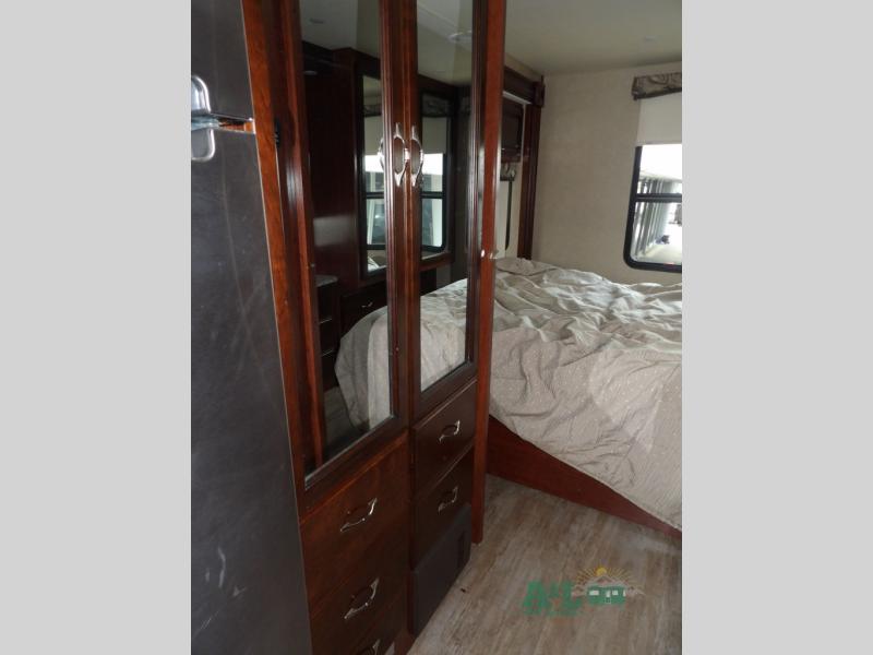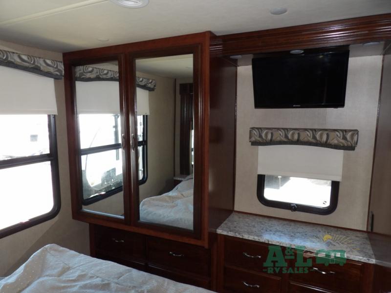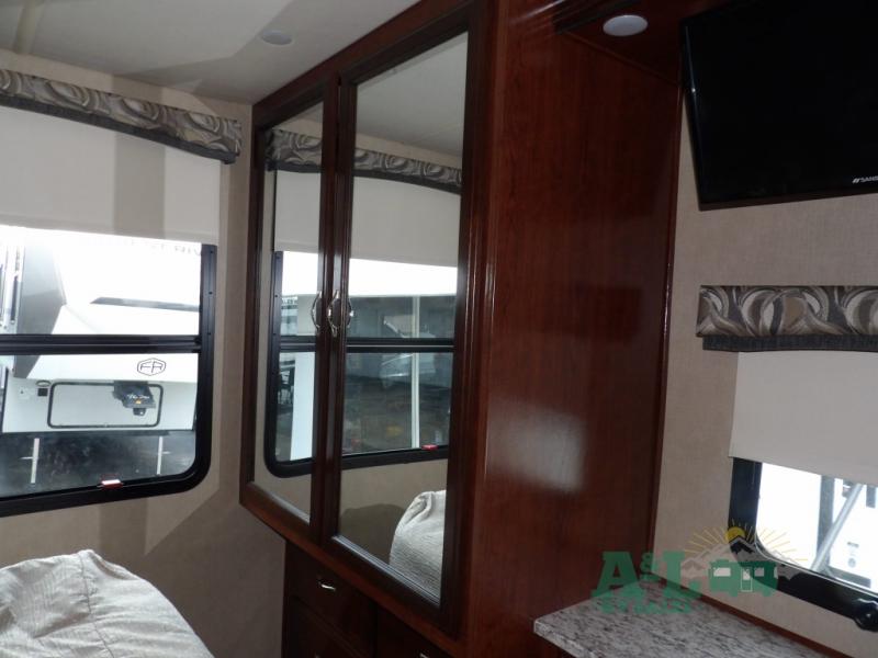 In the very rear you will find a relaxing space with slide out queen size bed including nightstands. There is also a dresser/wardrobe opposite, a 24" LED TV, and second wardrobe for clothing storage, plus more.