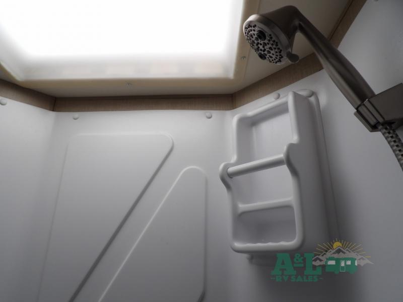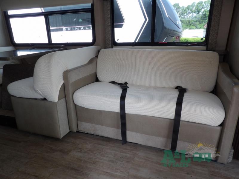 The slide opposite the curb side features a sofa bed and booth dinette. The sofa bed offers a shelf overhead for storage, plus both pieces offer two sets of seat belts for safety of your back seat travelers when moving down the road.