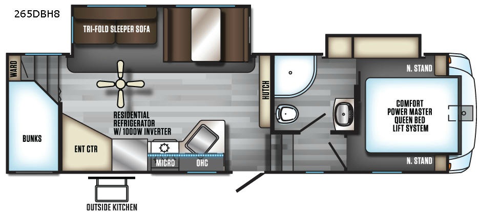 Opposite the road slide, next to the refrigerator, you will find an entertainment center where you can add an optional LED TV for your viewing pleasure.