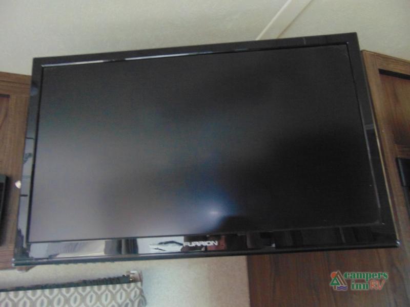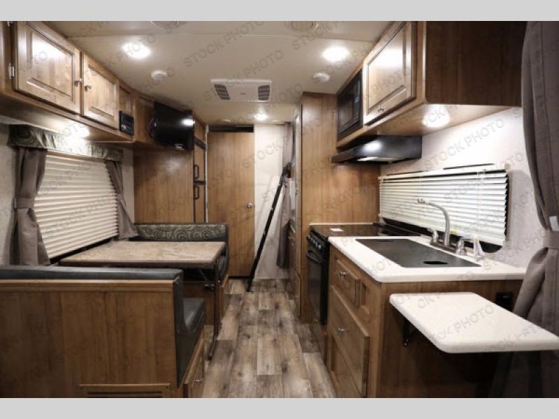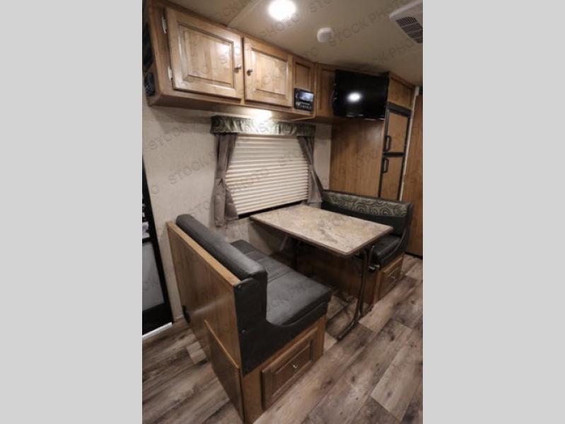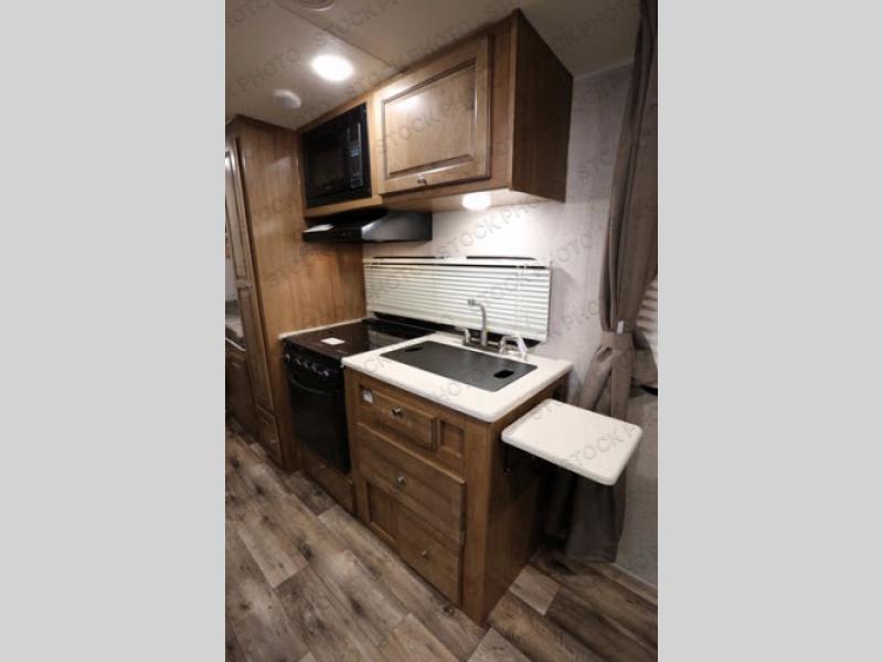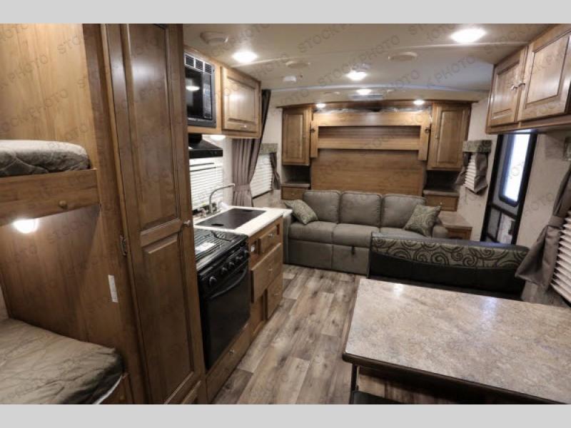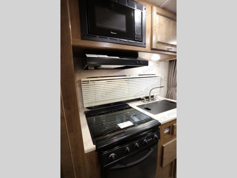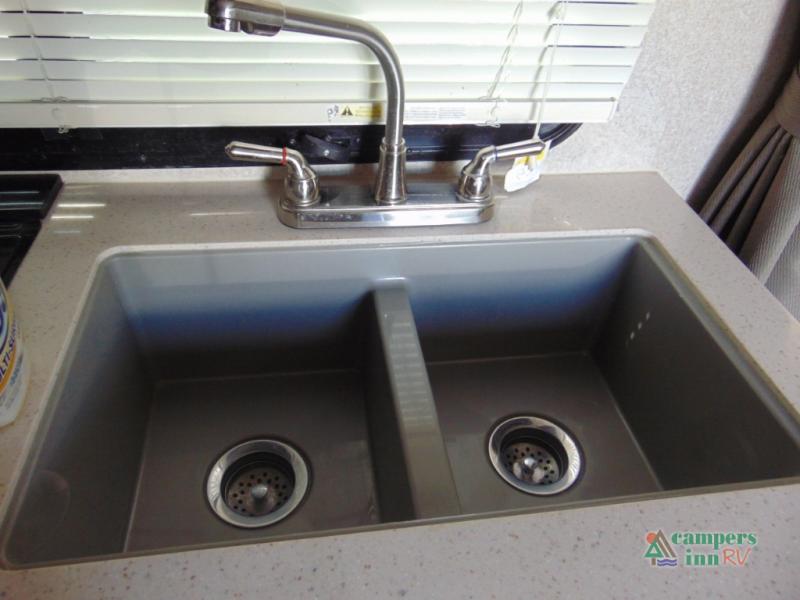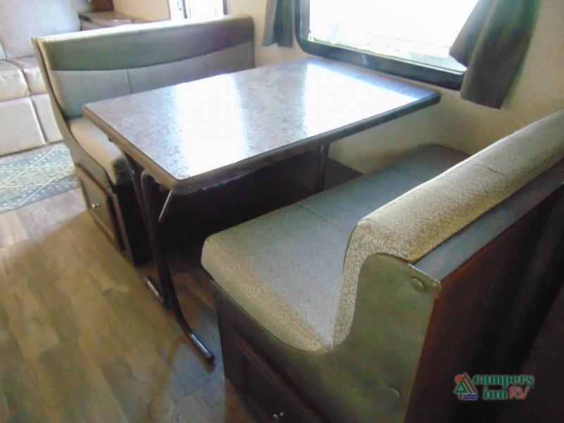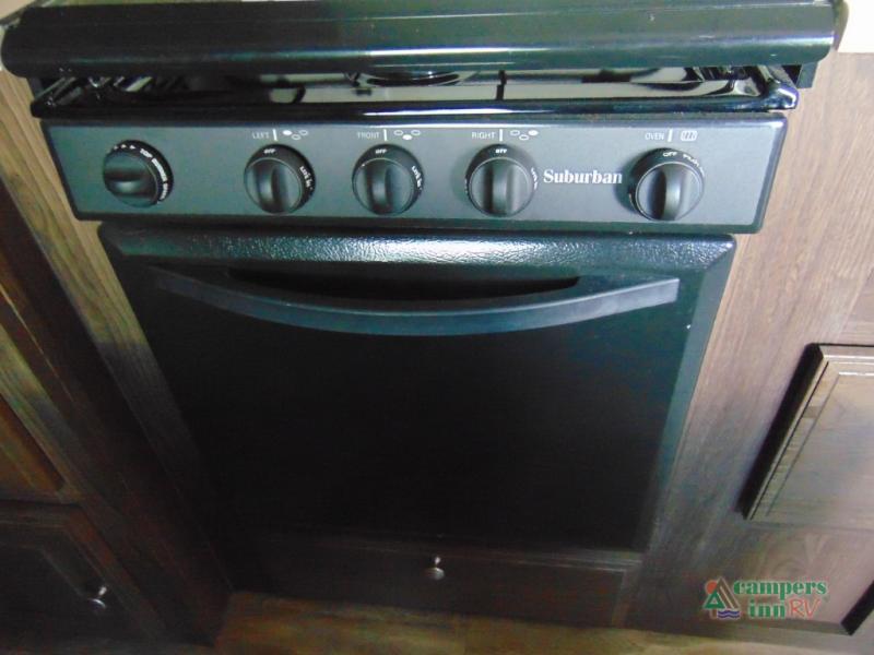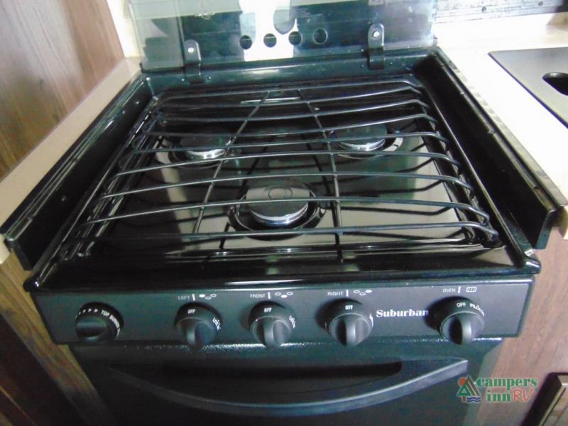 To the left of the entrance there is a dinette with an entertainment center above the dinette. Next to the dinette there is a refrigerator for your perishable items. Along the opposite side of the trailer you will find a double kitchen sink, microwave, three burner range, and wardrobe.