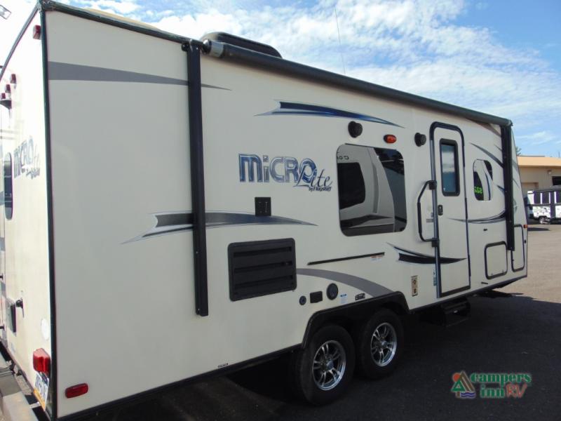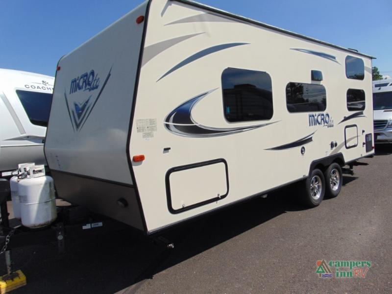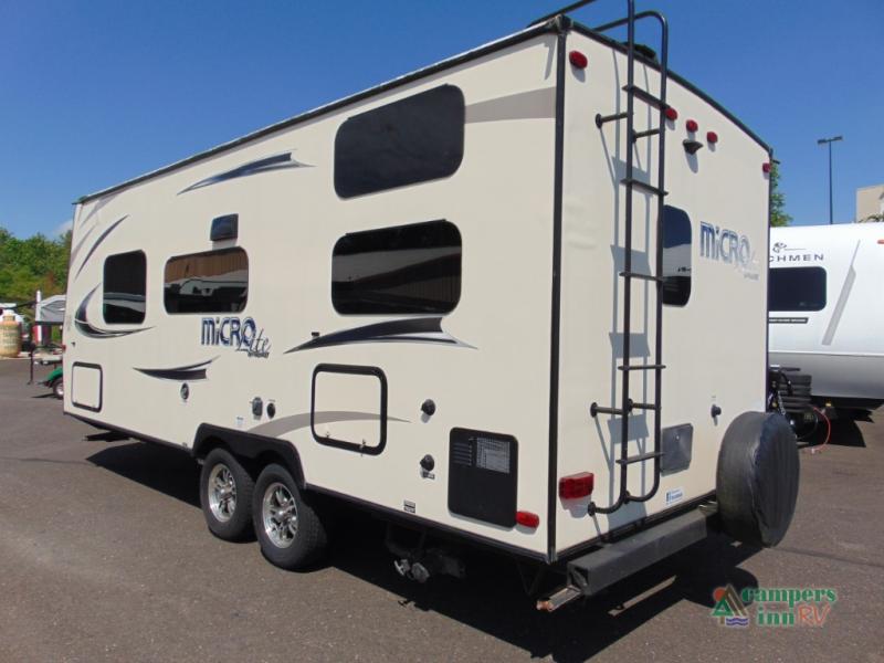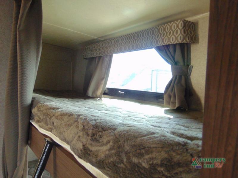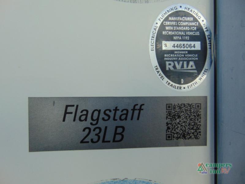 The Flagstaff Micro Lite 23LB travel trailer by Forest River has a rear set of double bunks, a front bedroom area, and a rear bath. This model can easily sleep up to five people.