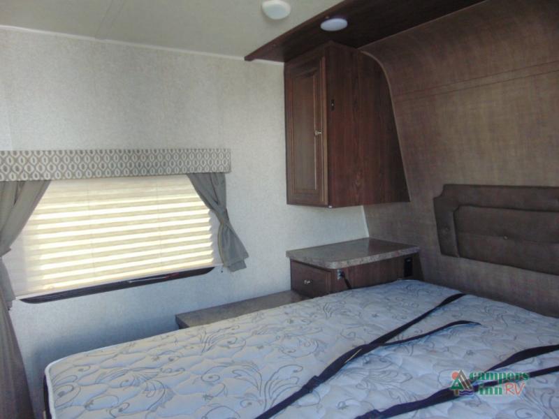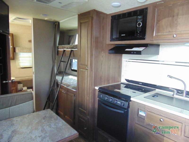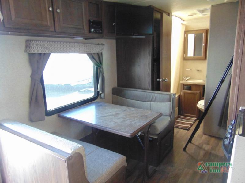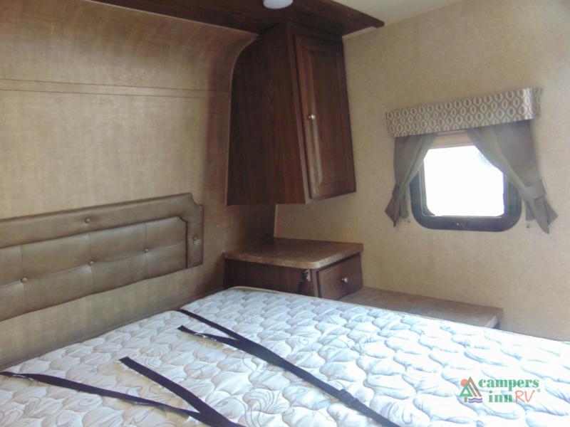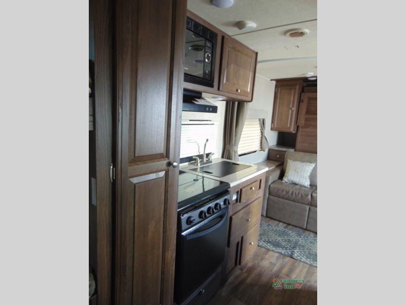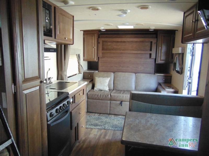 Throughout the inside of the trailer there are overhead cabinets and you will find exterior storage as well as a pass through storage area. There is also a 15' awning, an optional grill, and optional rear ladder, plus more!