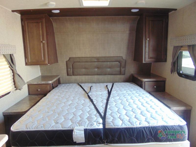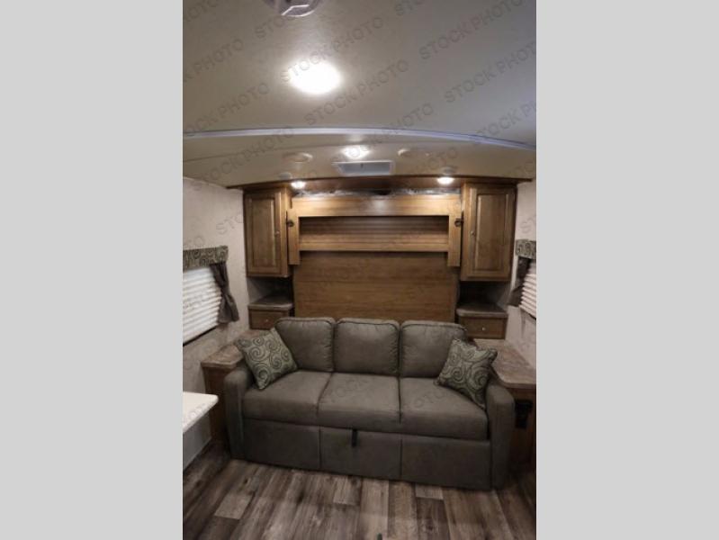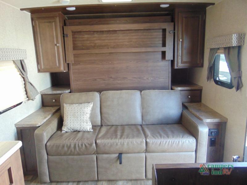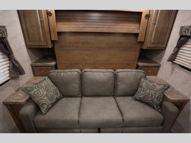 In the front of the trailer there is a bed with flip-up storage. You will find wardrobes and nightstands on either side of the bed. In place of the front room you can choose to have the Murphy bed option which features a sofa and a Murphy bed which easily pulls down into place at night.