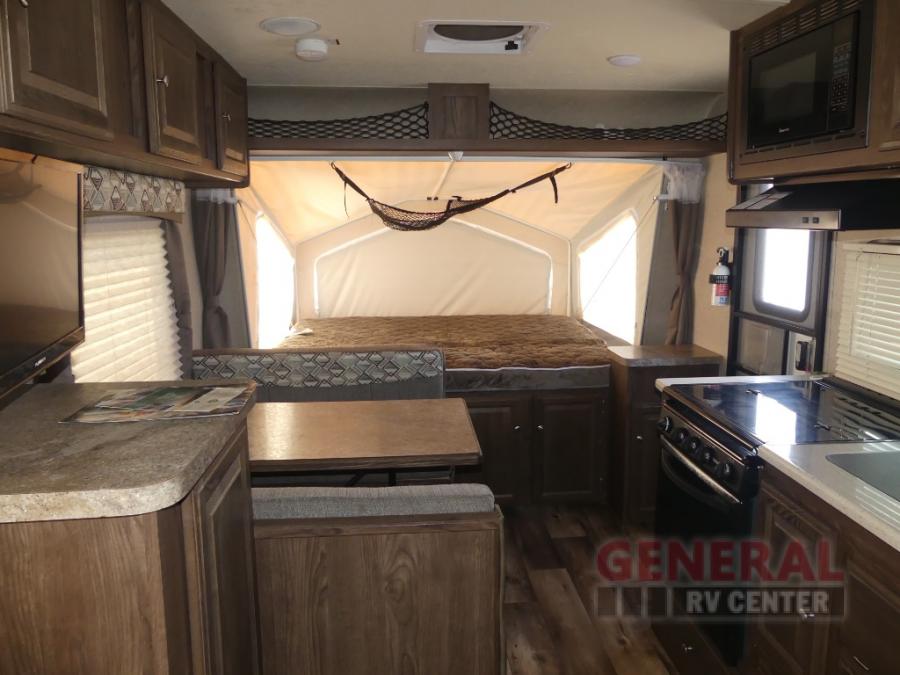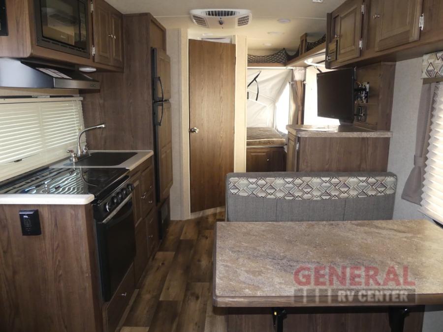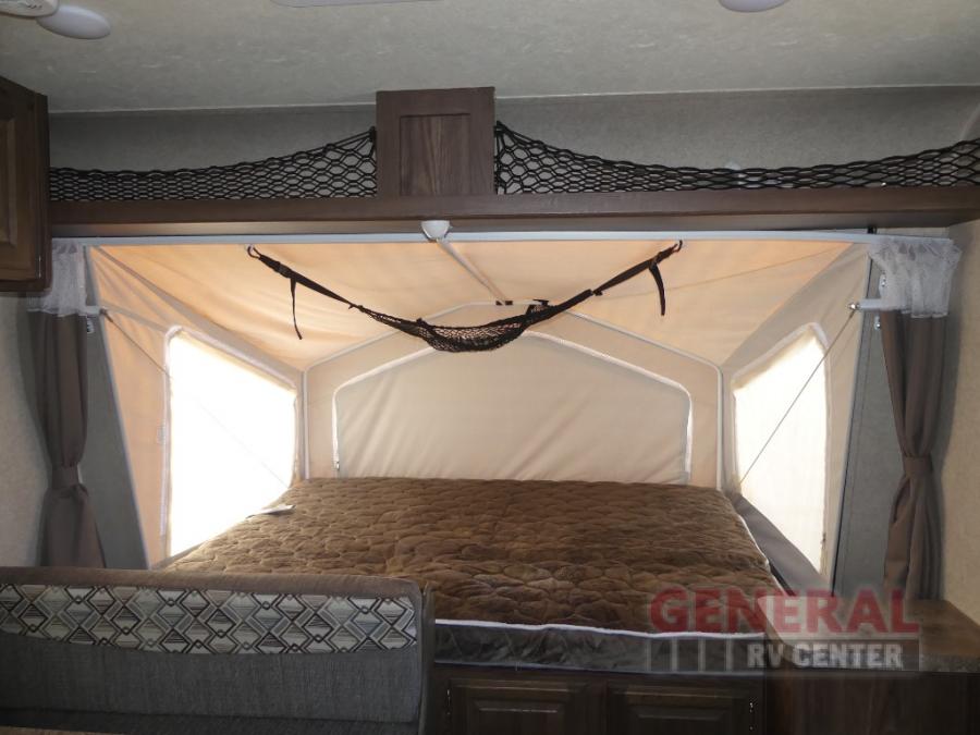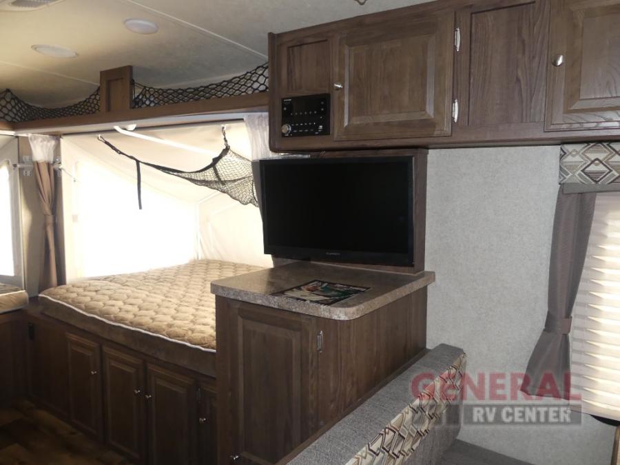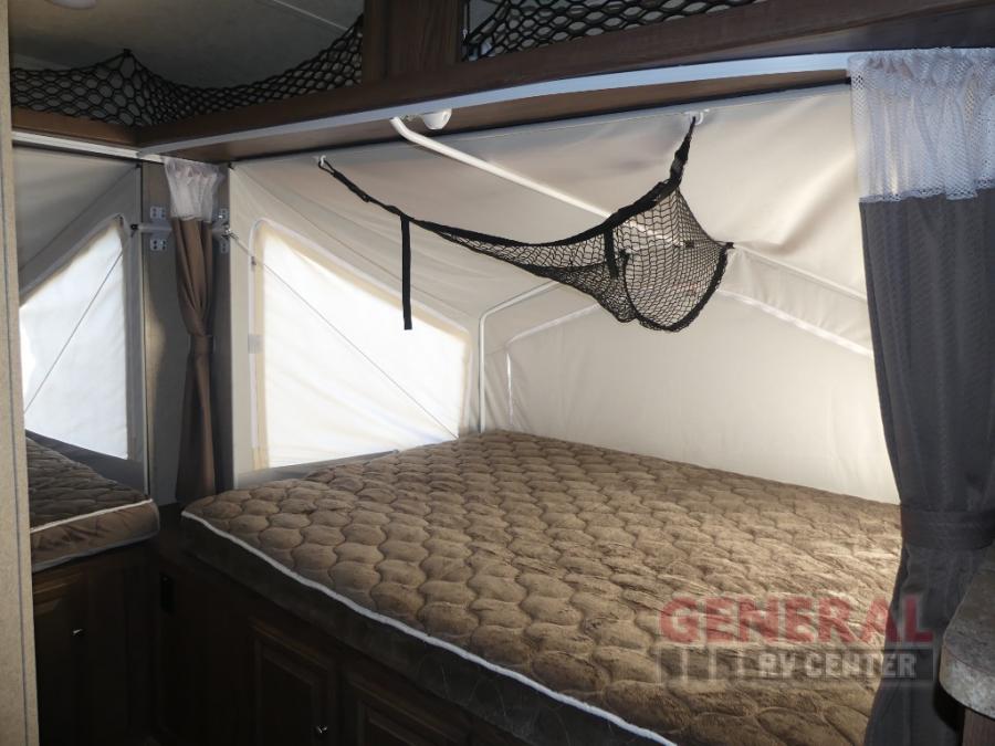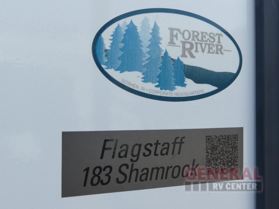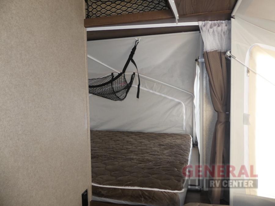This Flagstaff Shamrock 183 expandable travel trailer by Forest River offers plenty of sleeping space with three tent end beds. They are located in the front, rear, and along the road side wall. Shelf storage can be found above each tent opening, with a pantry below the road side bed opening.