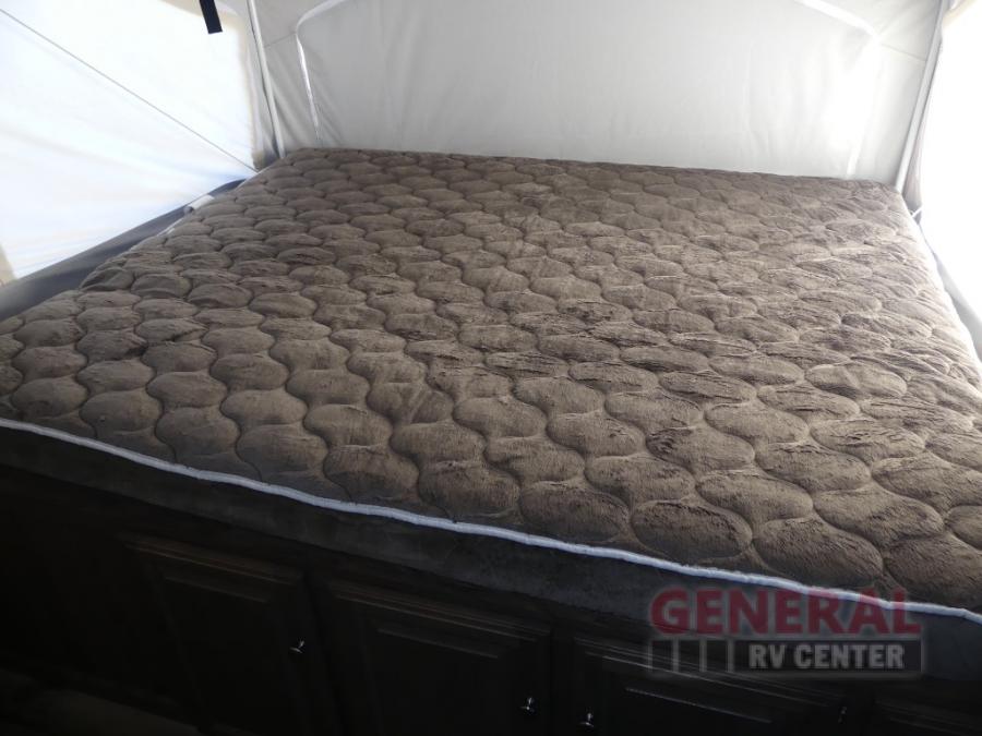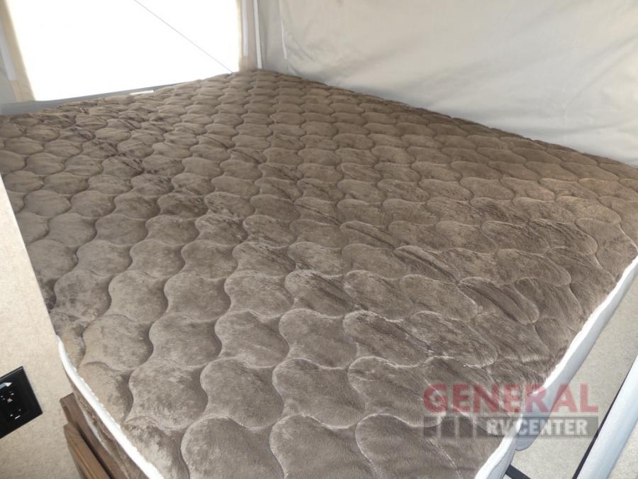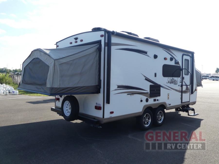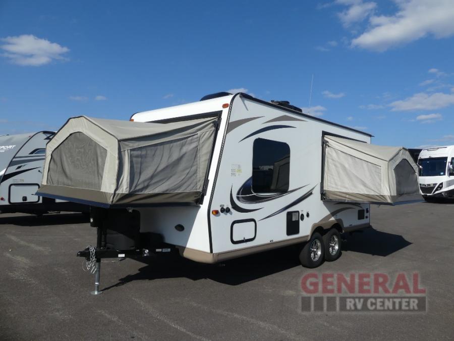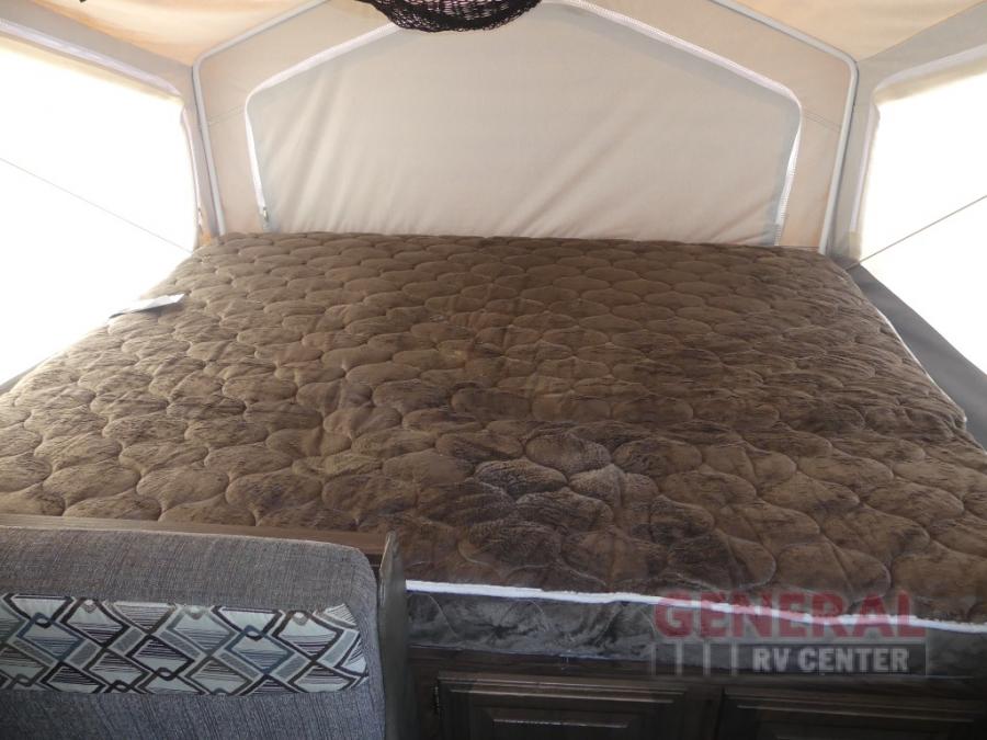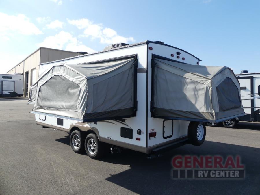This Flagstaff Shamrock 183 expandable travel trailer by Forest River offers plenty of sleeping space with three tent end beds. They are located in the front, rear, and along the road side wall. Shelf storage can be found above each tent opening, with a pantry below the road side bed opening.