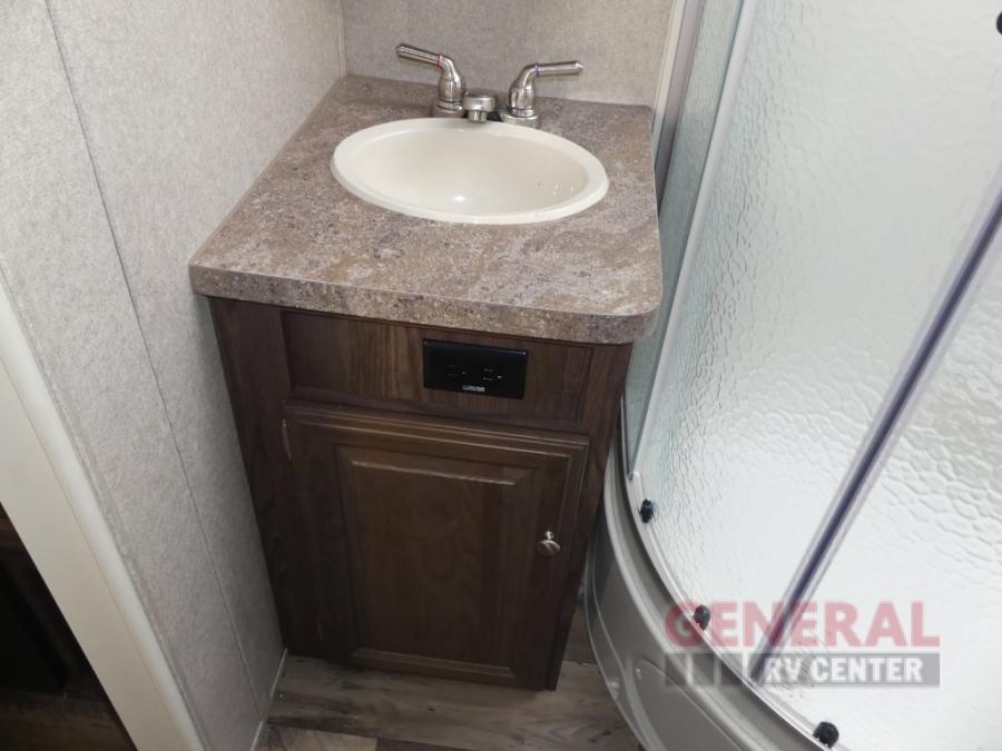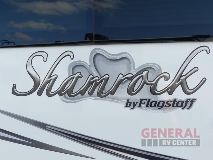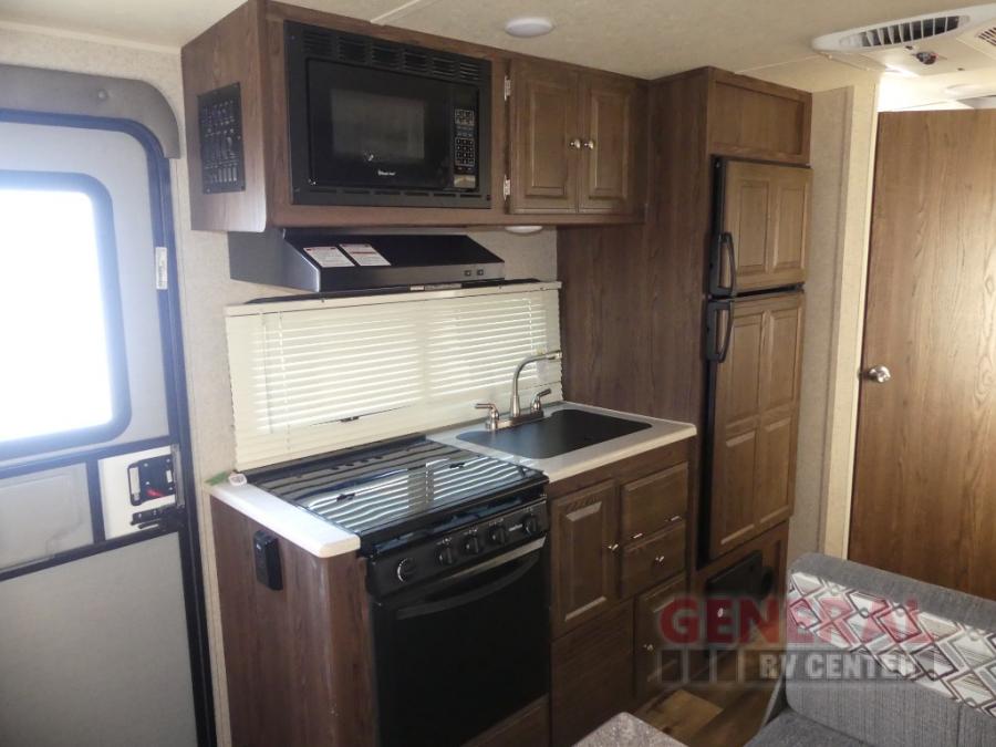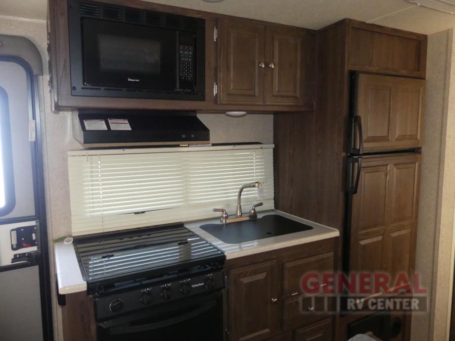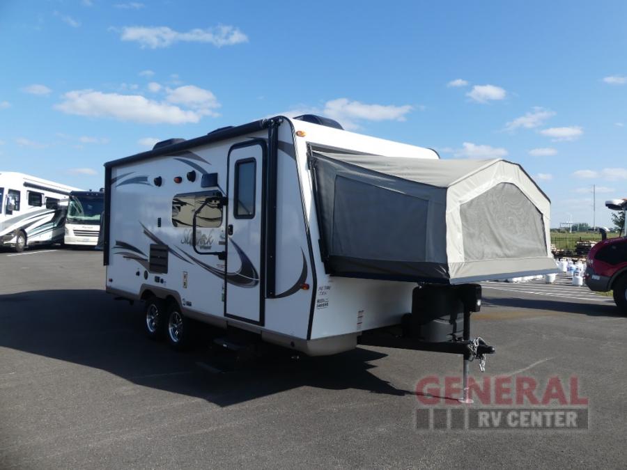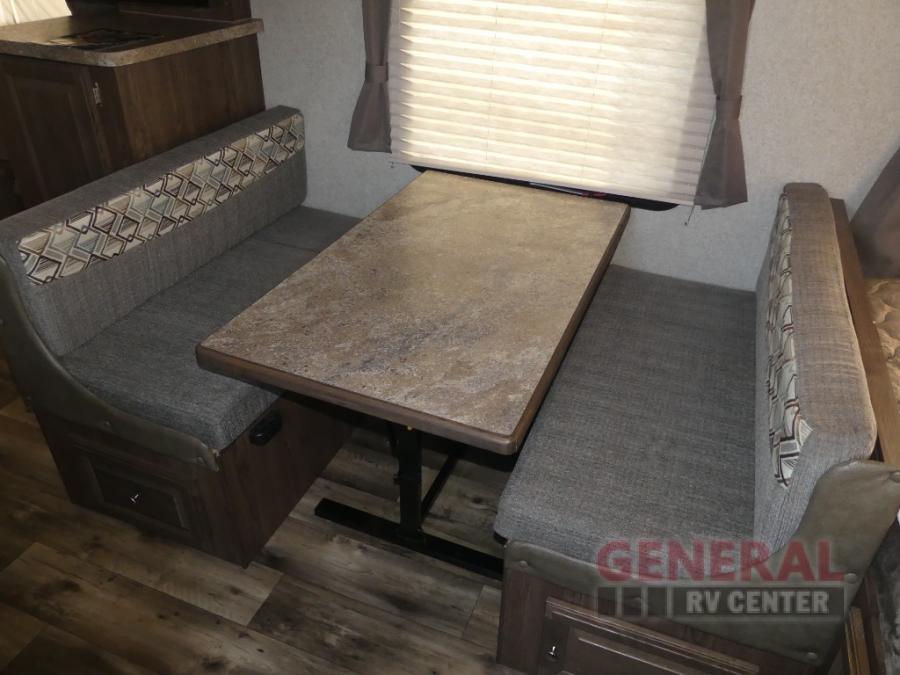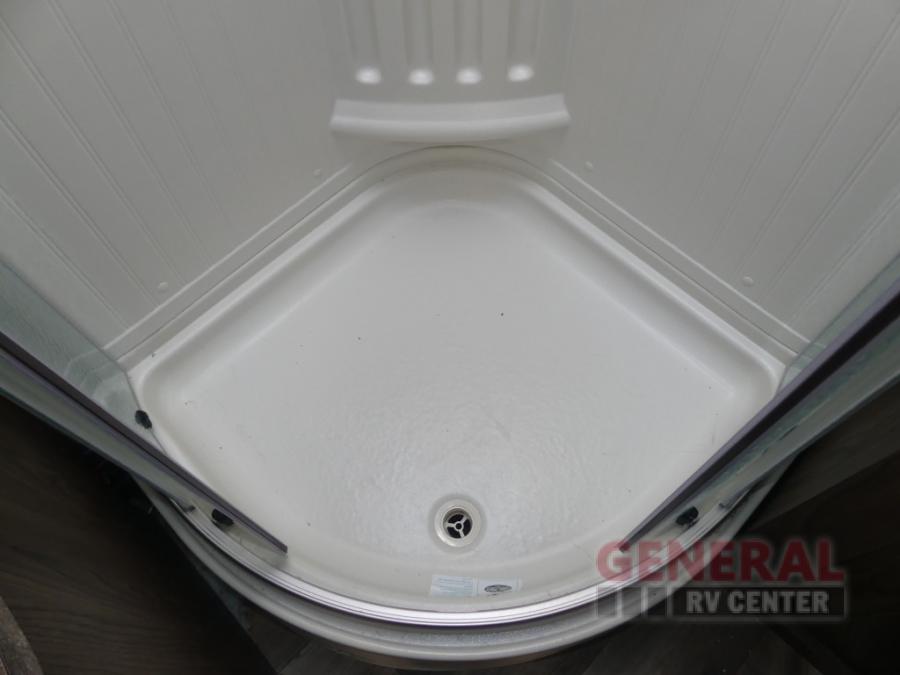 This Flagstaff Shamrock 183 expandable travel trailer by Forest River offers plenty of sleeping space with three tent end beds. They are located in the front, rear, and along the road side wall. Shelf storage can be found above each tent opening, with a pantry below the road side bed opening.