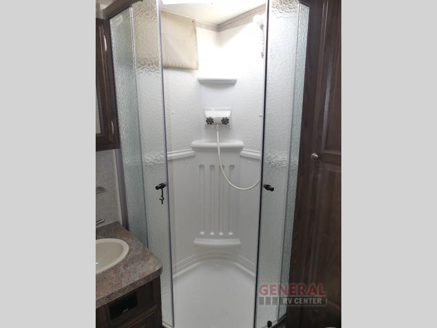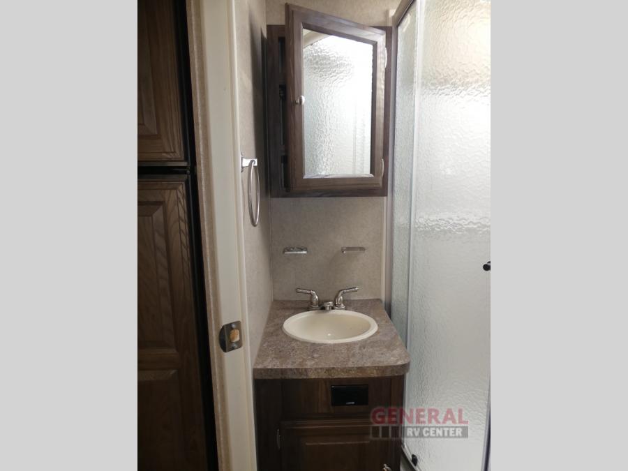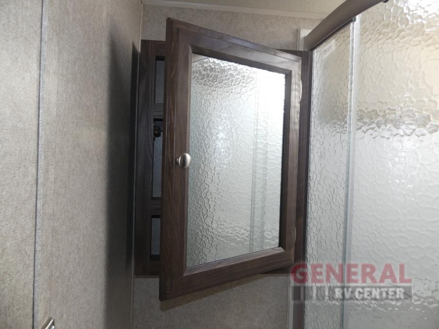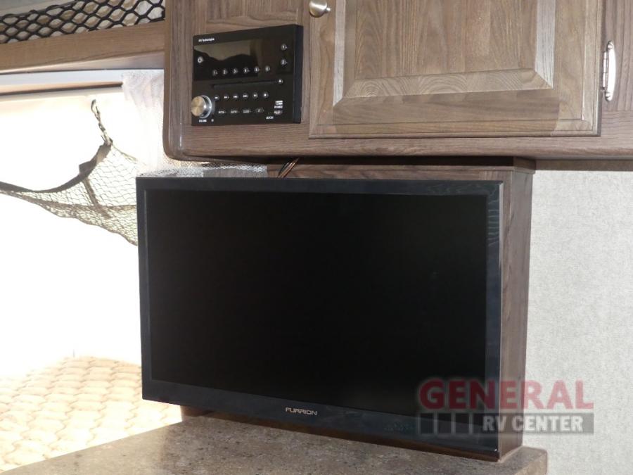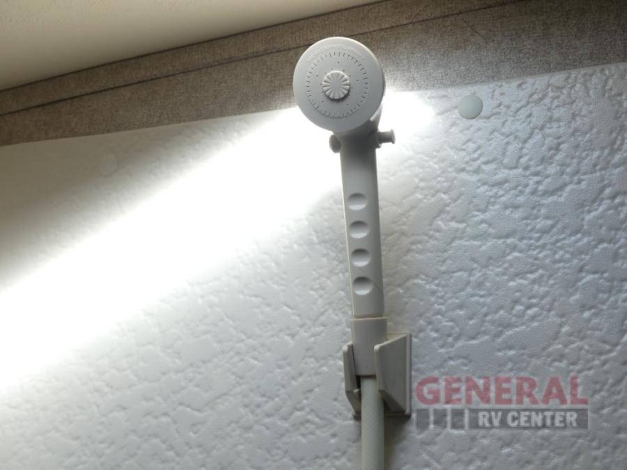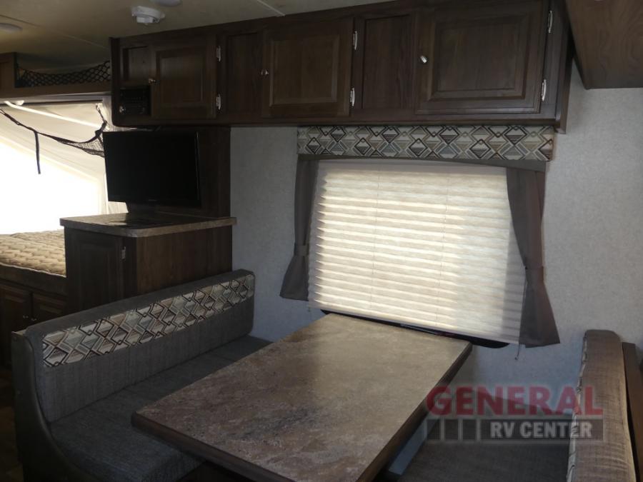 As you enter, there is a nightstand immediately to your right. Across from the door, you will find a 44" booth dinette, overhead storage, a wardrobe, and an entertainment center.