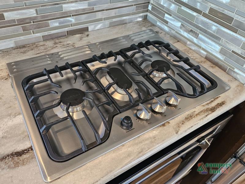 - Residential Kitchen: Stainless steel appliances, including a residential refrigerator, a three-burner range, microwave, and double kitchen sink, make meal preparation a breeze.