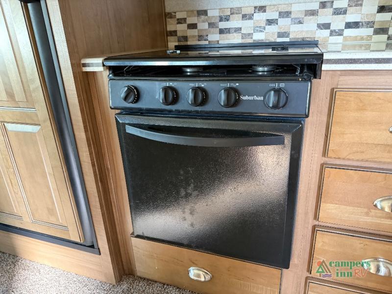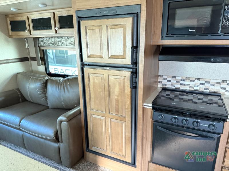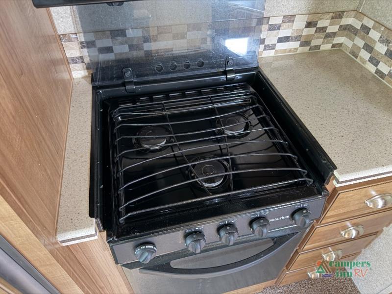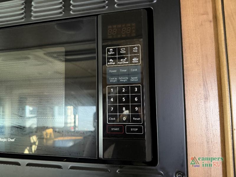 - Residential-style refrigerator and three-burner range with overhead microwave
