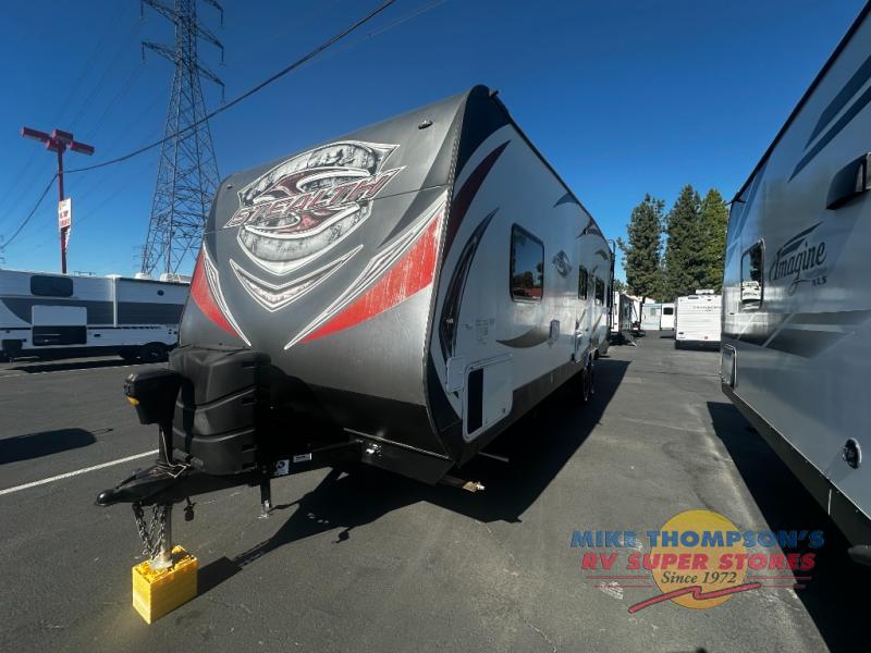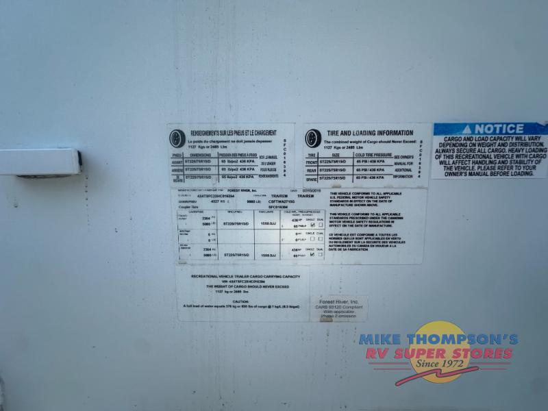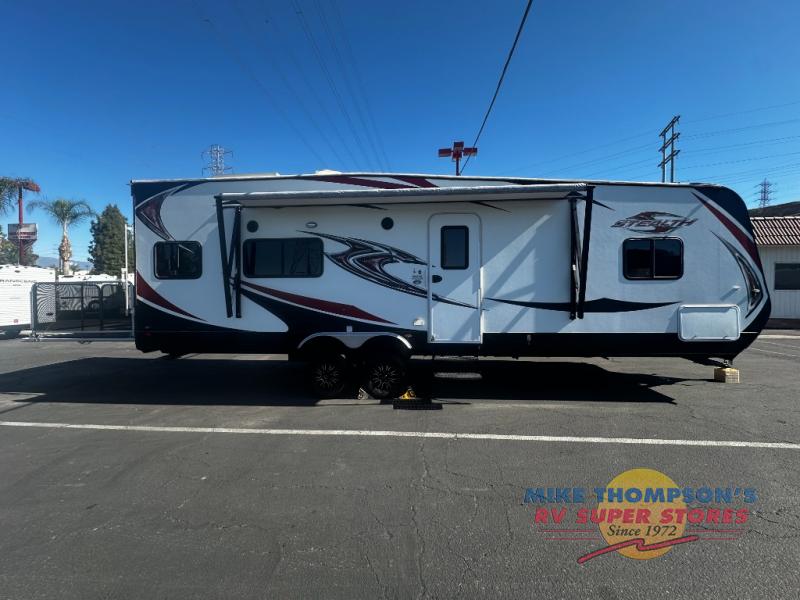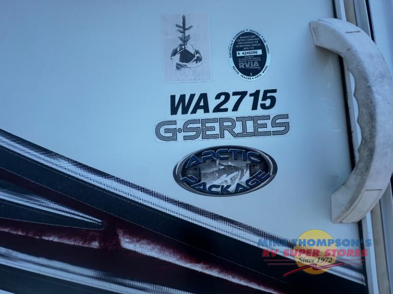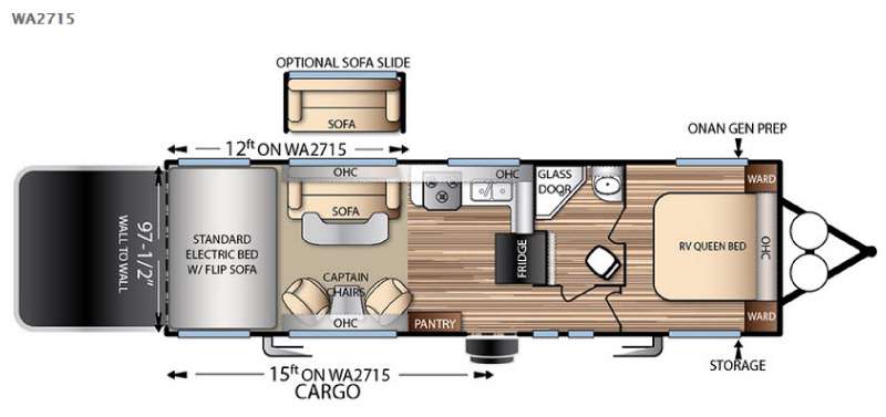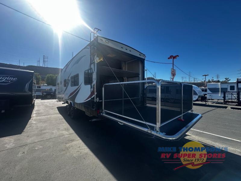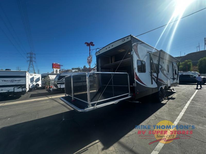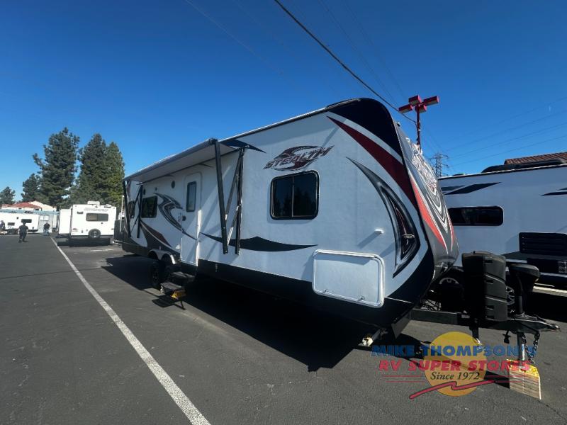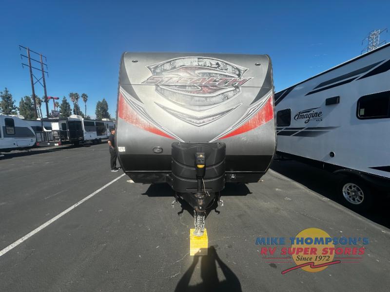 Up to 15' of cargo space can be found in the Stealth WA2715 toy hauler travel trailer by Forest River. A rear ramp door allows easy access.