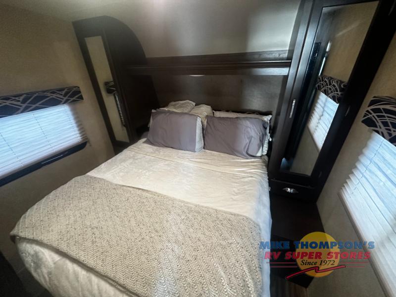 The front bedroom includes an RV queen size bed with wardrobes at each side and overhead cabinets above the head of the bed.