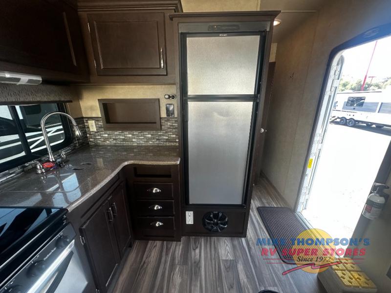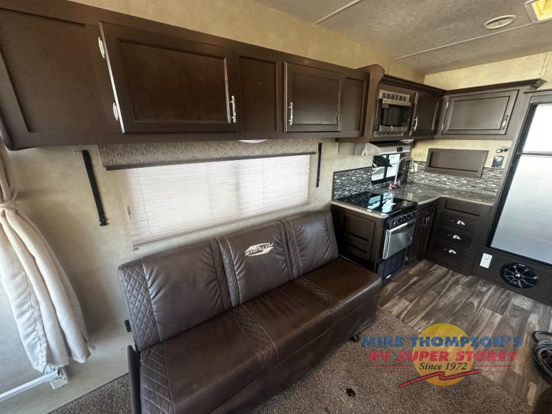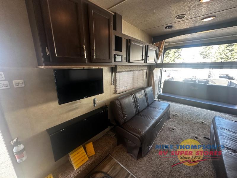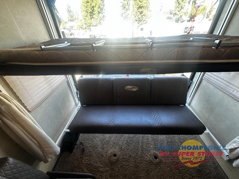A standard electric bed with flip sofa is at the back of the garage area. Moving forward, there is a sofa with table and overhead cabinets on one side. You may choose an optional sofa slide for even more interior floor space. The opposite side has two captains chairs with a table between them as well as overhead cabinets.