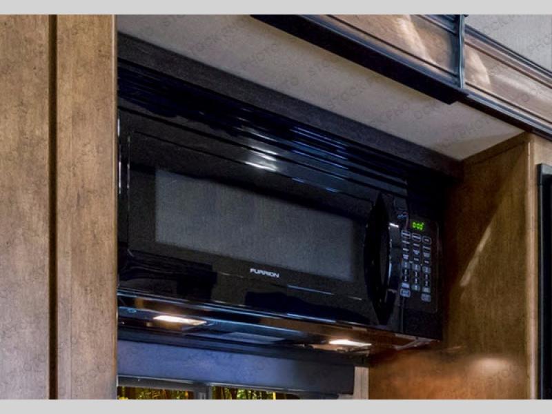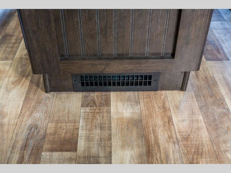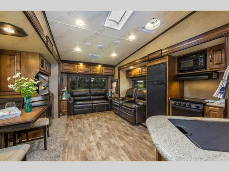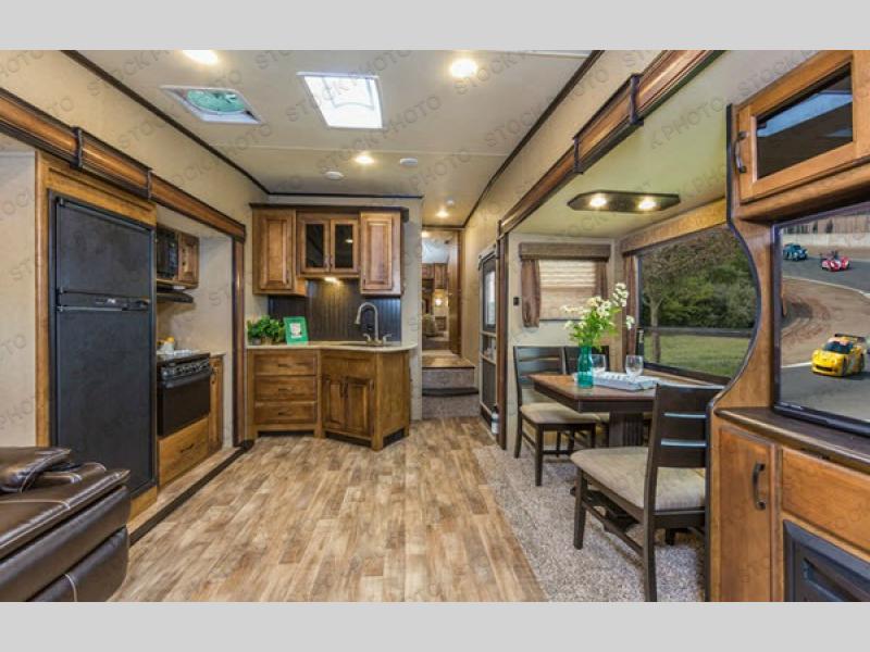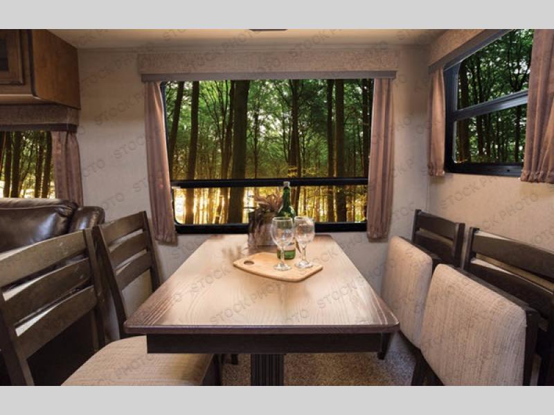 As you enter notice the spaciousness inside with dual opposing slide outs on either side of the unit. The slide to your left of the entry door features a booth dinette, or optional free standing dinette (pictured) along with an entertainment center, 40" TV and fireplace including overhead cabinets.