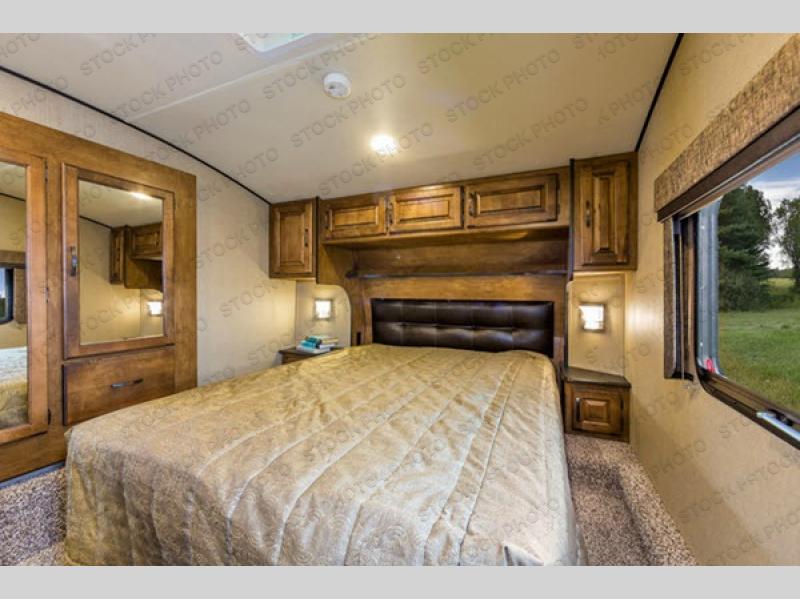 The private front bedroom can be entered from the hallway door, or through the sliding door in the bathroom. In the bedroom find a queen bed with overhead cabinets, bedside nightstands, and a slide out double wardrobe that also contains the bathroom linen cabinet.