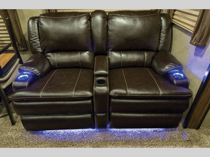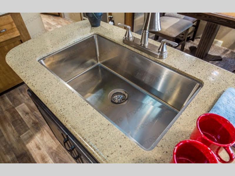 The slide opposite the door side features even more seating with theatre seats for two including cup holders and overhead cabinets for your things. There is also a refrigerator, and three burner range with convection microwave oven within the slide out too. Along the interior living area wall find a countertop with a kitchen sink, overhead storage, plus lower cupboards and drawer space for dishes and things.