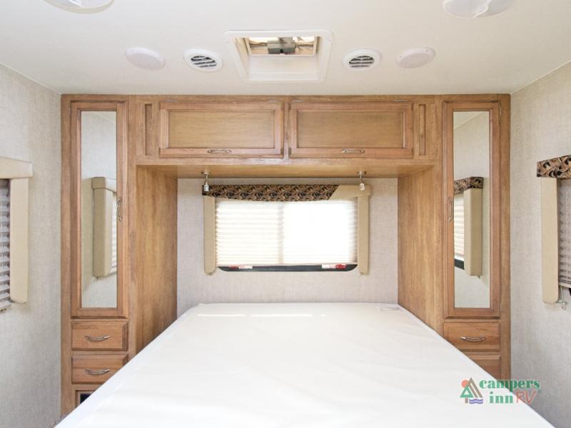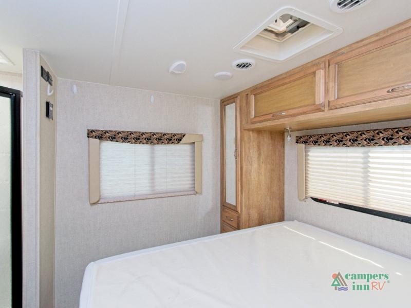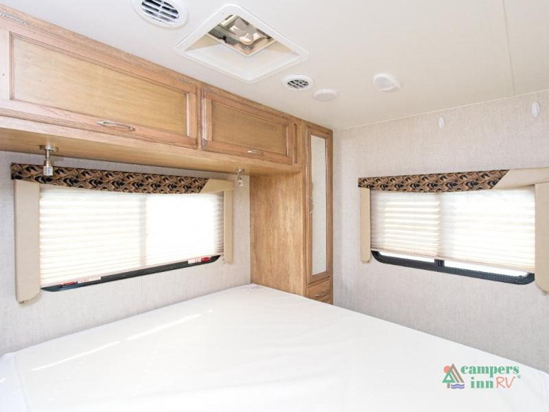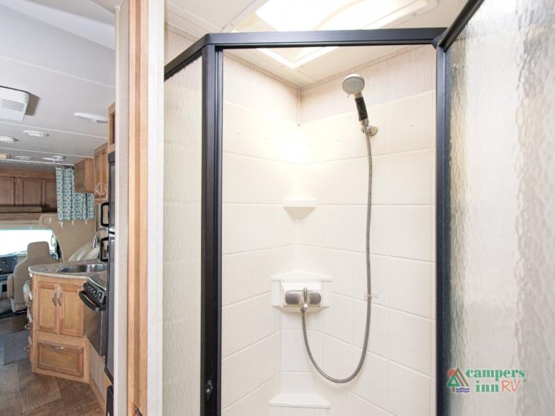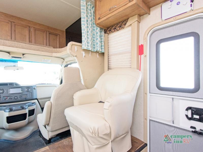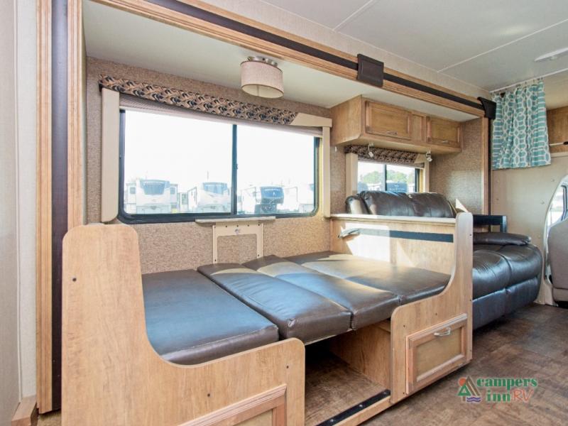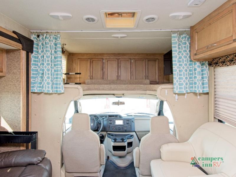 - Comfortable Cab Area: Above the cab, you'll find a bunk for extra sleeping space or optional storage. Add an optional swing-arm TV for entertainment while parked.