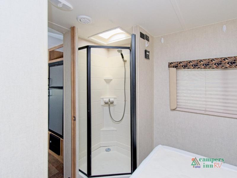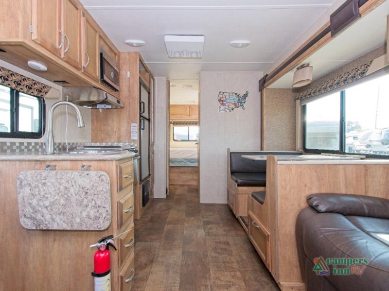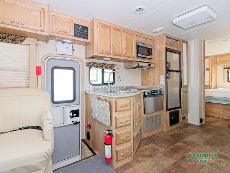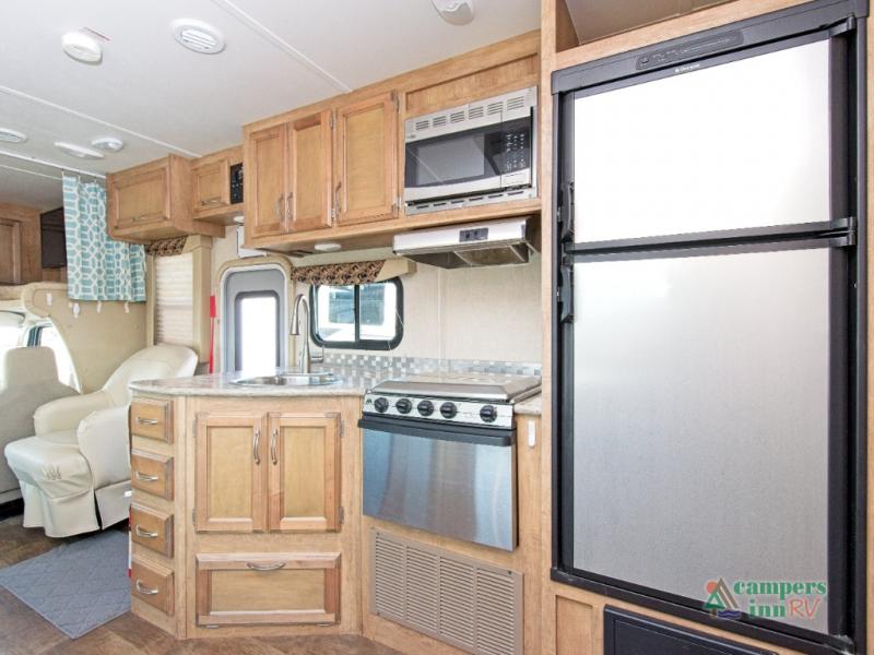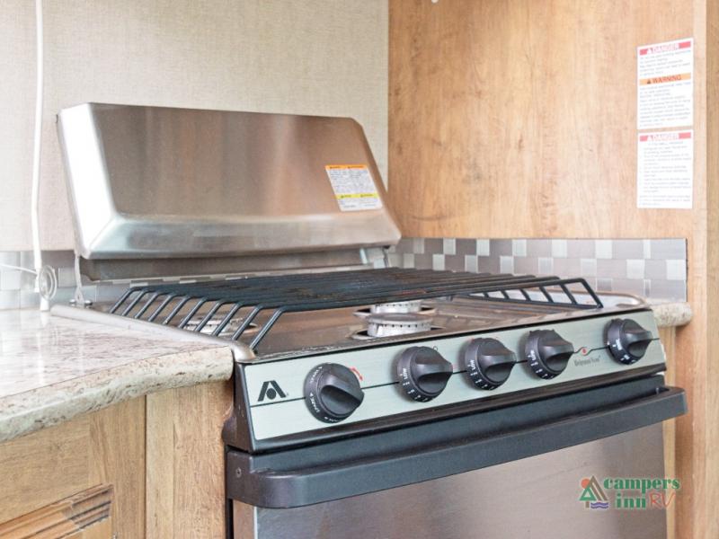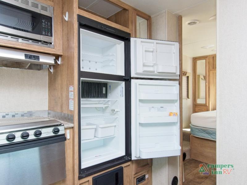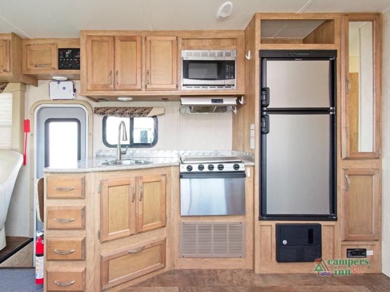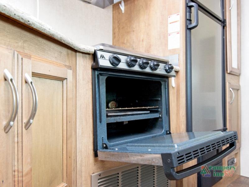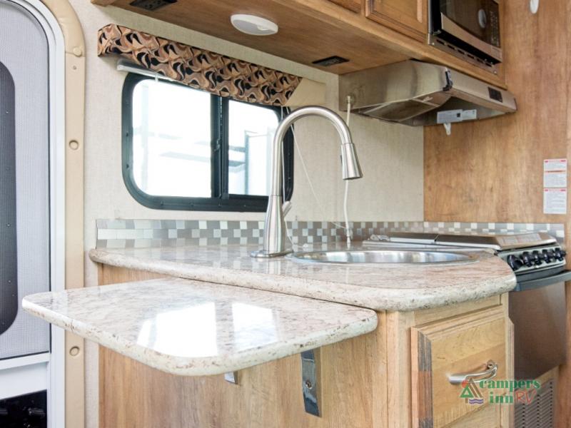 - Fully Equipped Kitchen: Cook with ease using the angled countertop, double sink, 3-burner range, microwave, refrigerator, and pantry—everything you need to prepare meals on the go.