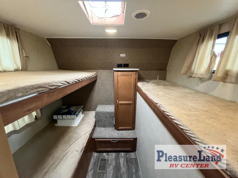 Step inside and see a front bunk room with one set of bunks on the left, a center wardrobe, and an overhead bunk on the right. There is an entertainment center just outside the bunk room door that can easily be viewed from any seating in the space.