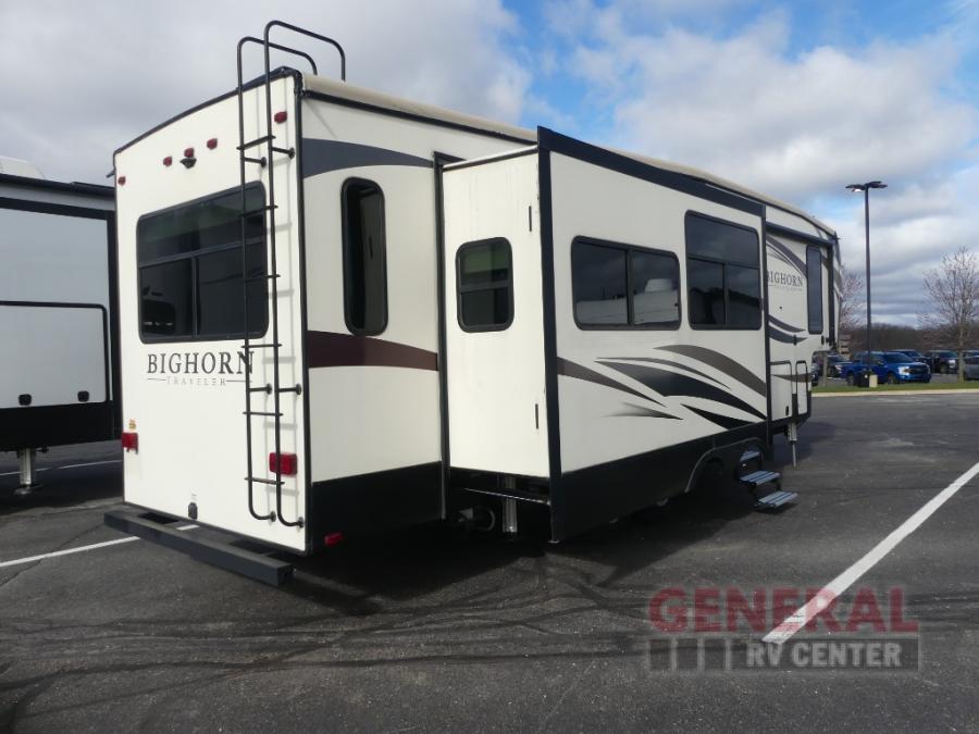This Bighorn Traveler is the perfect couples coach! This unit features triple slides, a rear living layout, a king size bed, and center island for added convenience in the kitchen.