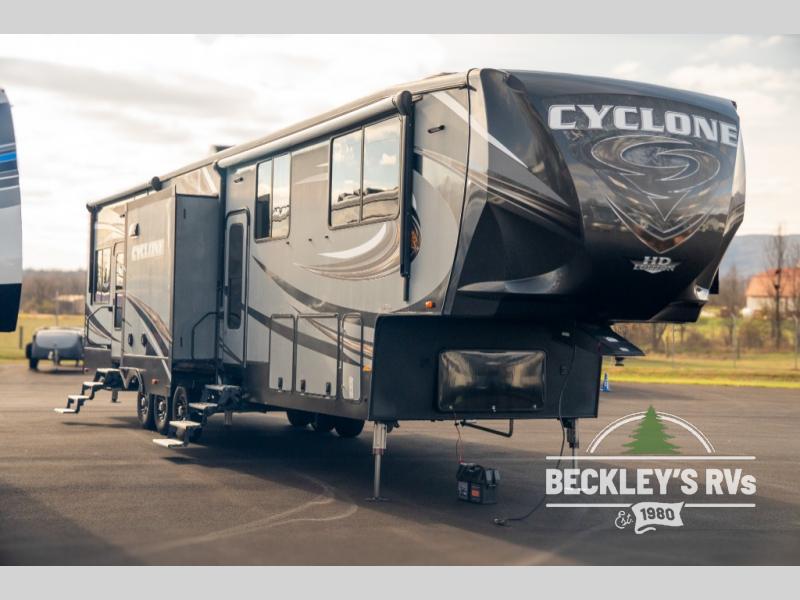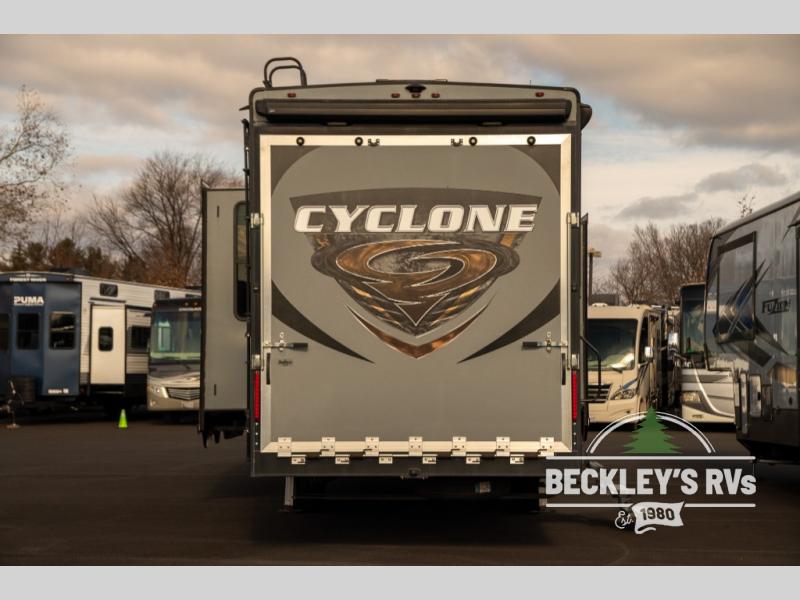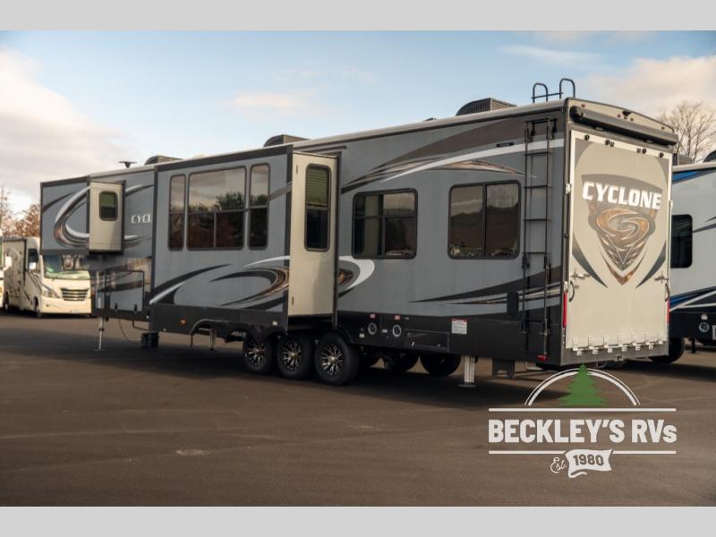 This Cyclone 4100 King fifth wheel toy hauler by Heartland has 12' cargo garage for your toys, and a luxury suite for you when you are done playing and want to relax in comfort! This unit features triple slide outs for added space, a loft area the kids will love, one and a half baths, and a king bed in the master suite, plus more!