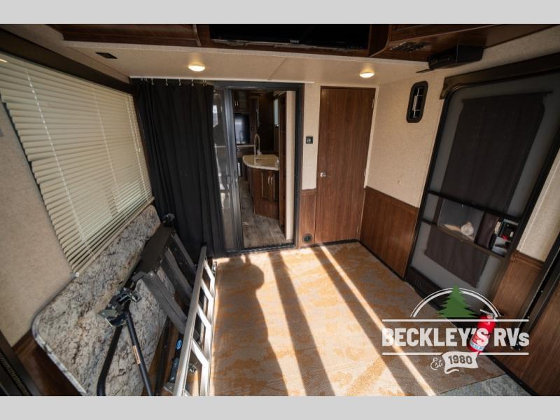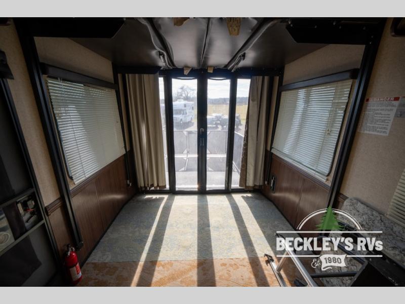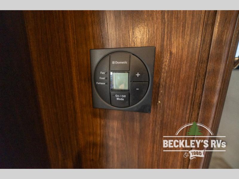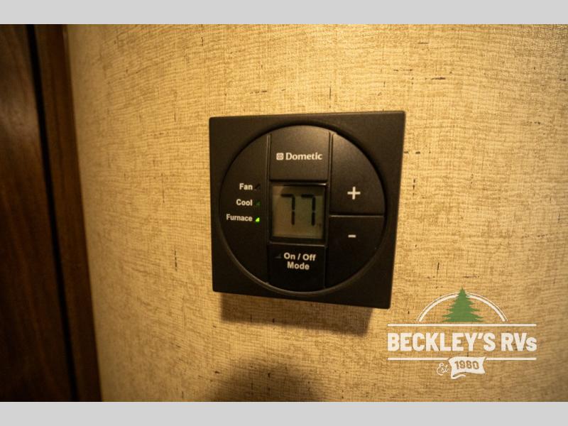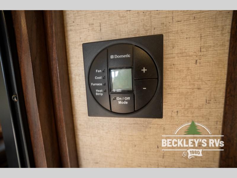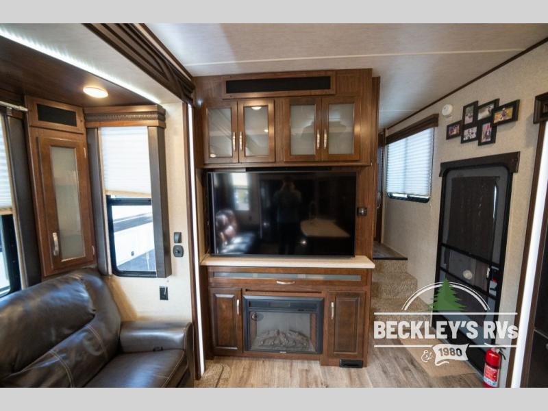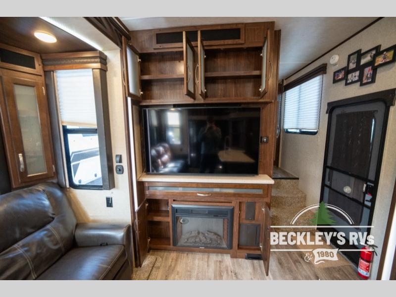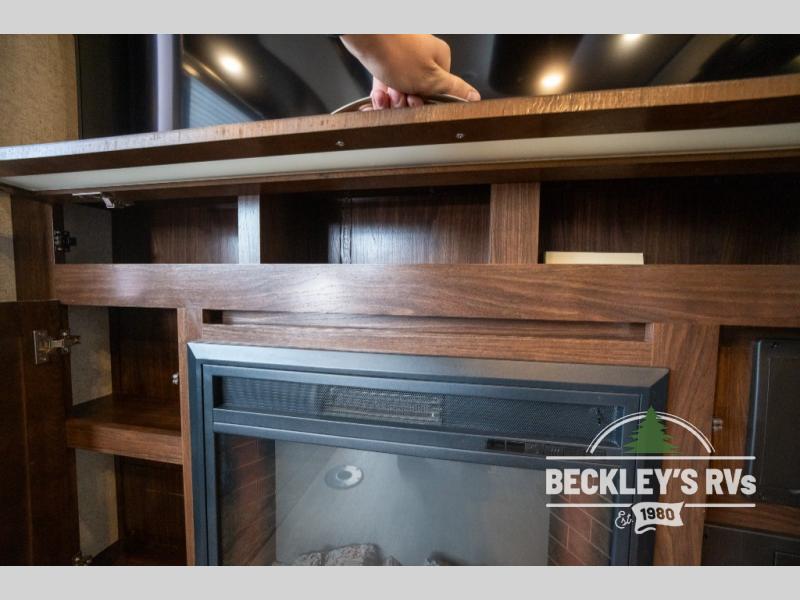 Opposite in the main living space find a large slide out sofa with two tables for meal time use. Enjoy the entertainment center nearby with a flat screen TV and storage both above and below. You can also find an electric fireplace if you want to add a warm glow to your evenings indoors.