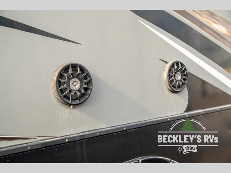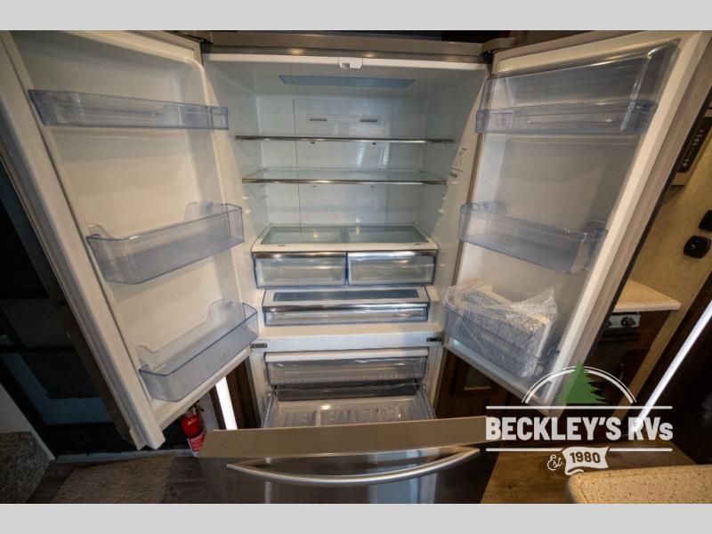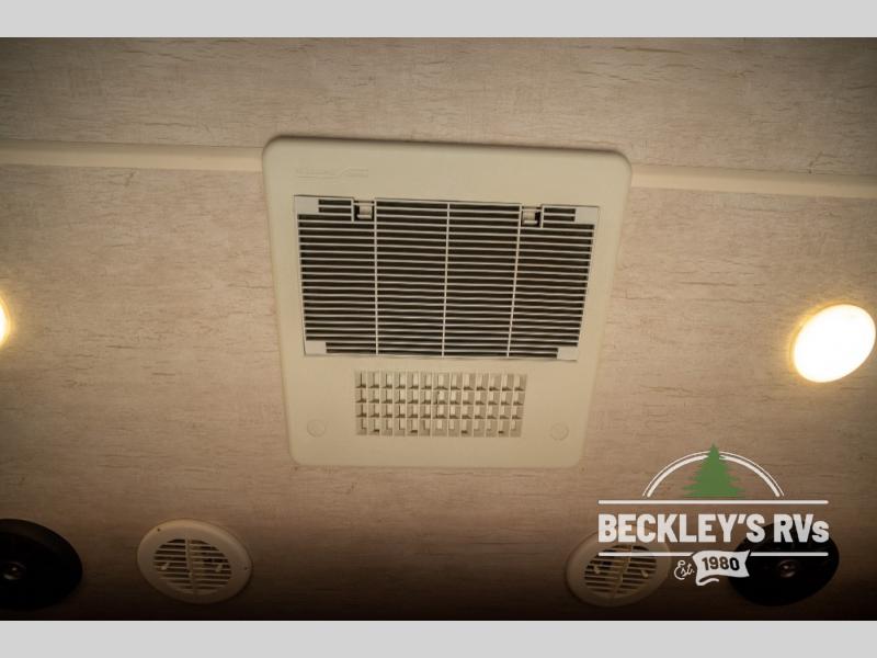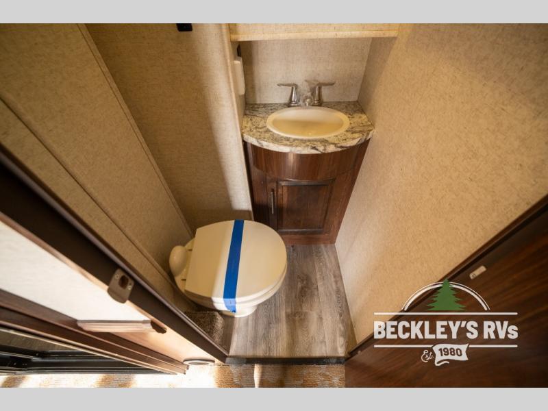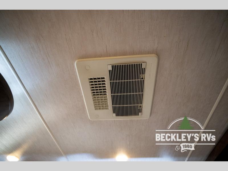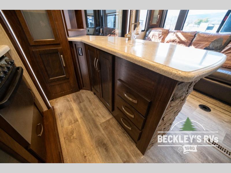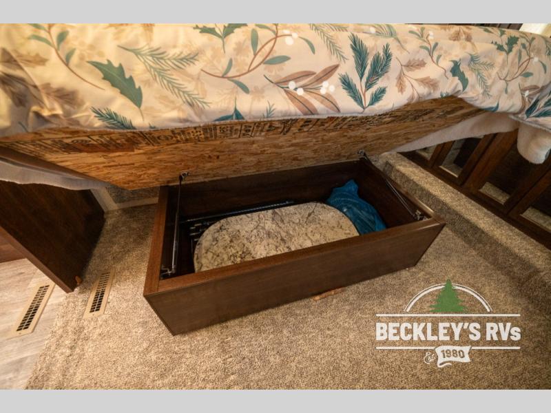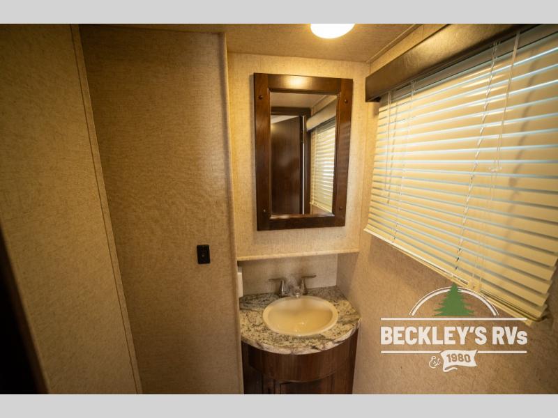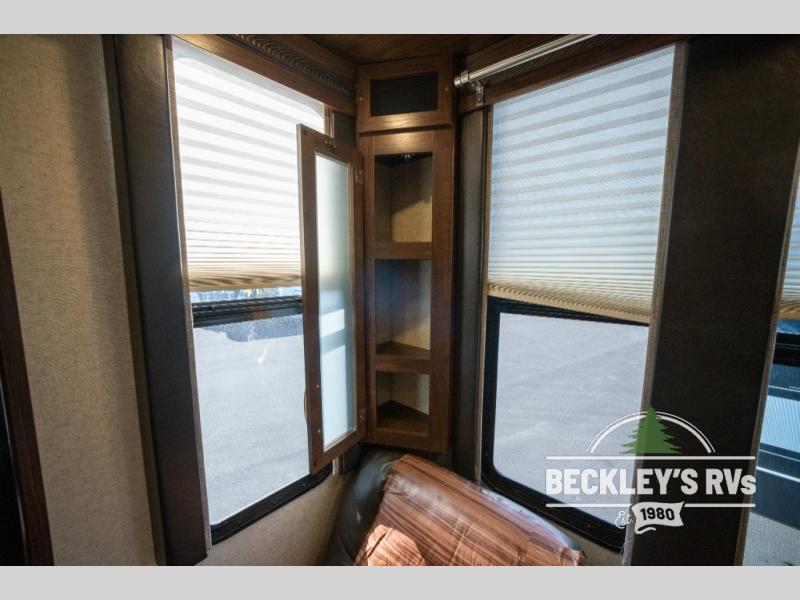 Opposite in the main living space find a large slide out sofa with two tables for meal time use. Enjoy the entertainment center nearby with a flat screen TV and storage both above and below. You can also find an electric fireplace if you want to add a warm glow to your evenings indoors.