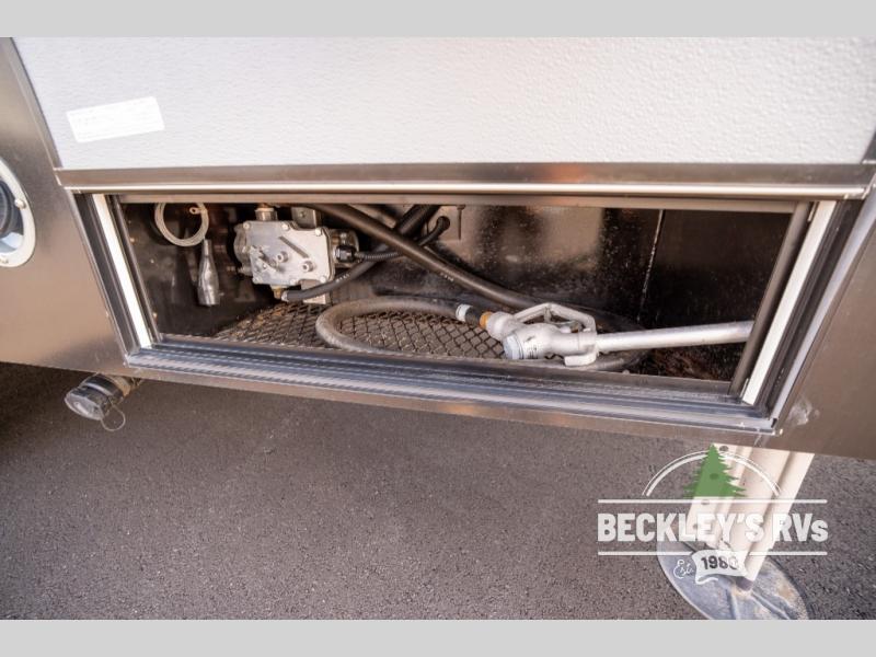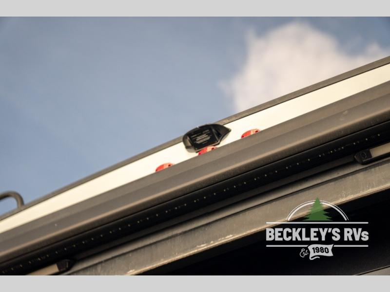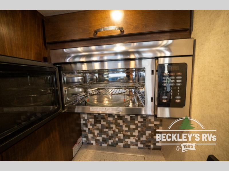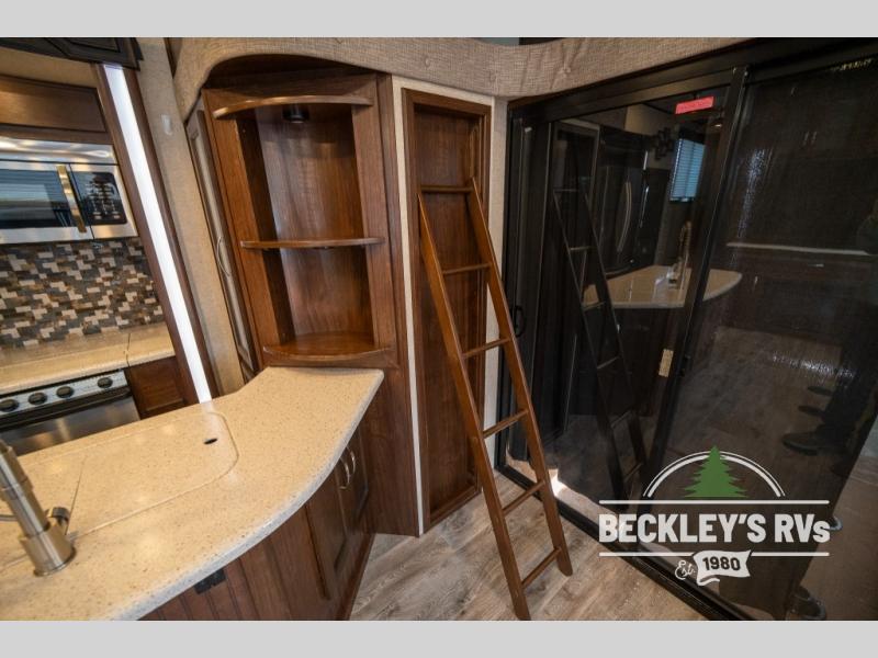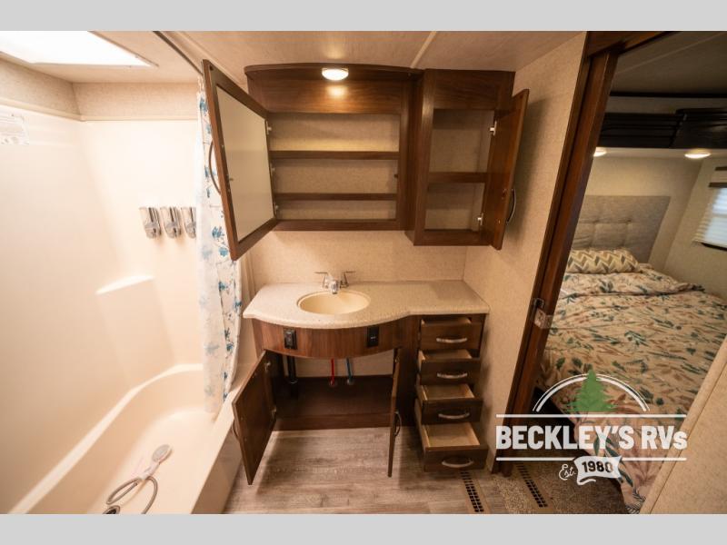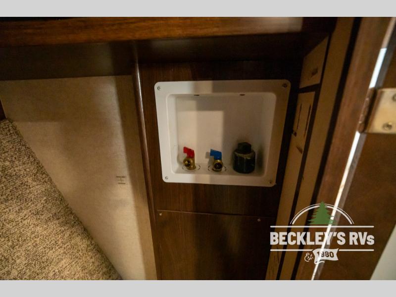 Step inside and enjoy the wide open feel with dual opposing slides in the main living area. There is a slide out to the left of the door featuring a refrigerator, counter space, and a three burner range with microwave overhead. There is an additional storage cabinet just off the slide before the counter peninsula that includes a double kitchen sink. Above the counter on the wall you will find open corner shelving. Just around the corner there is a ladder that leads to the loft that overlooks the floor with sleeping for two.