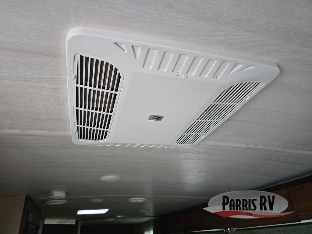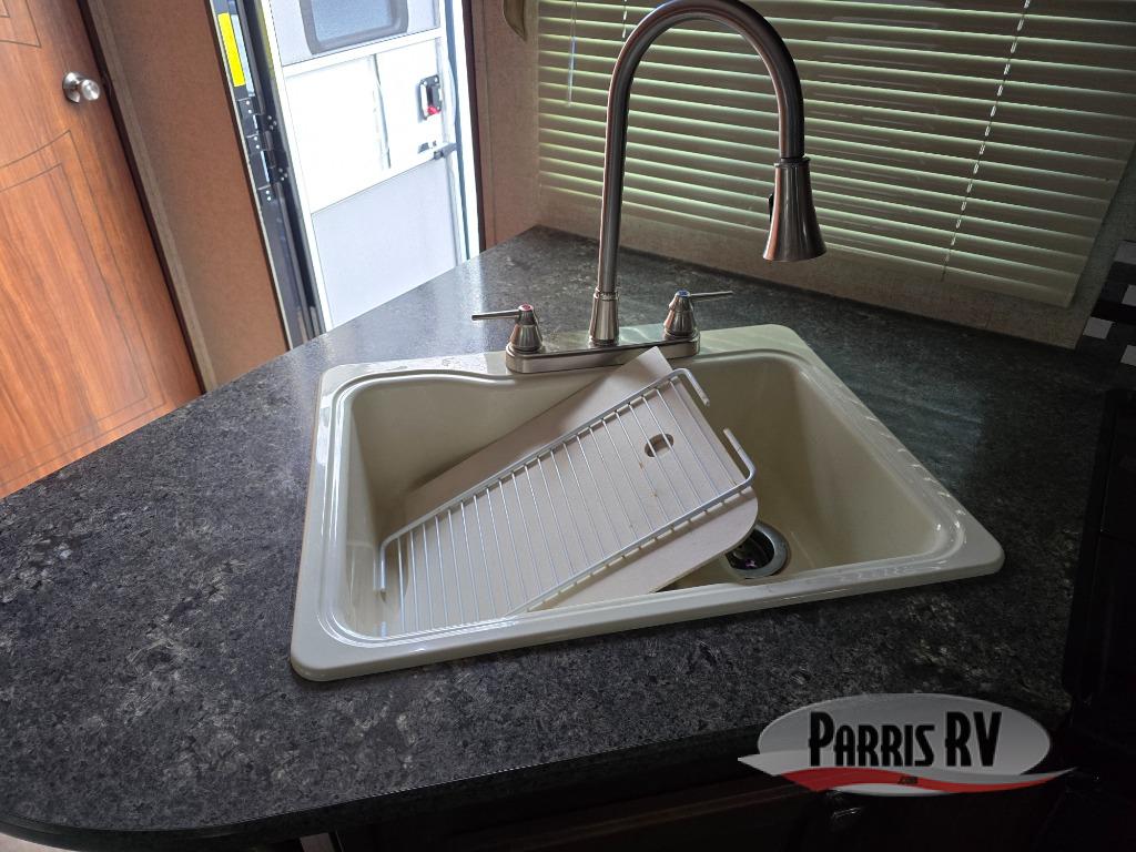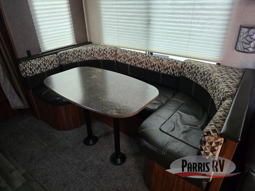 Step inside the main entry to see the wide open space provided by the road side slide out that features a u-shaped dinette, and sofa with overhead storage. The entertainment center is along the interior wall with a swivel TV allowing viewing from the living/kitchen area or the bedroom.
