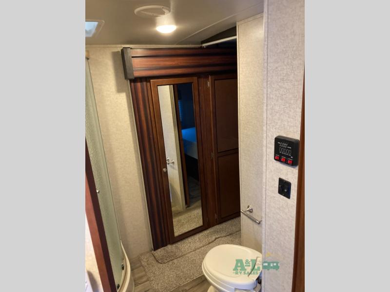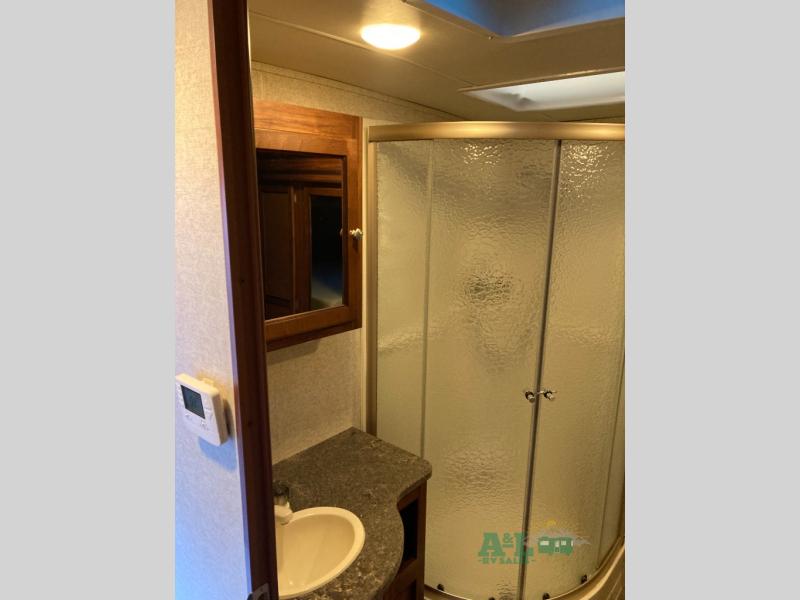 As you enter model 302, to your left there are two recliners with an end table between plus overhead storage for games and things. Along the interior wall there is an entertainment center with TV for your enjoyment. Next is a slide out sofa with overhead cabinets, and a u-shaped dinette providing more walking around room.