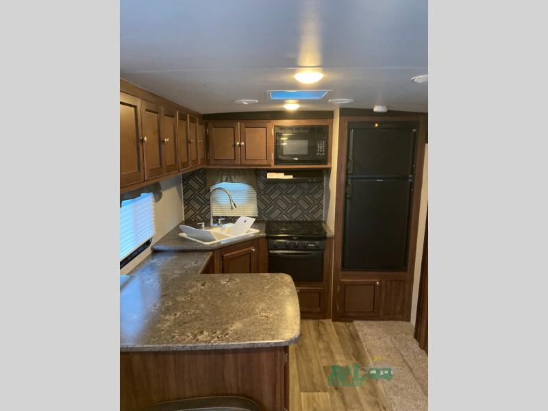 The kitchen begins along the rear wall with a refrigerator, three burner range, and counter space that wraps around the corner to the curbside wall. There is a double kitchen sink, and overhead storage on both walls. An L-shaped countertop along the curbside wall forms a u-shaped area allowing plenty of prep or serving space for meals and entertaining friends.