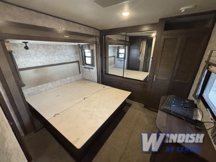 Inside the bedroom you will enjoy a spacious layout due to the queen slide out bed with a dresser opposite along the curb side wall. The front features a full wall wardrobe with sliding doors, plus a washer and dryer prepped closet for added storage if you choose not to add units, and so much more!