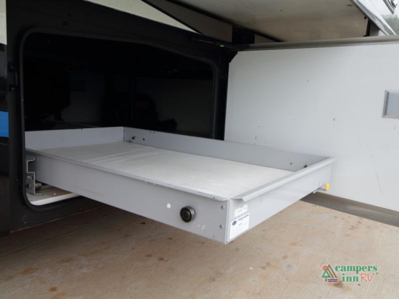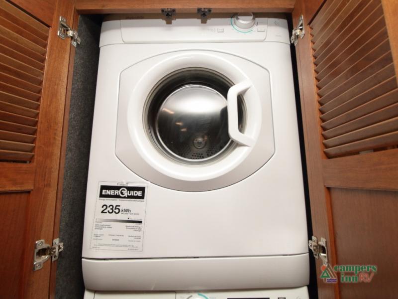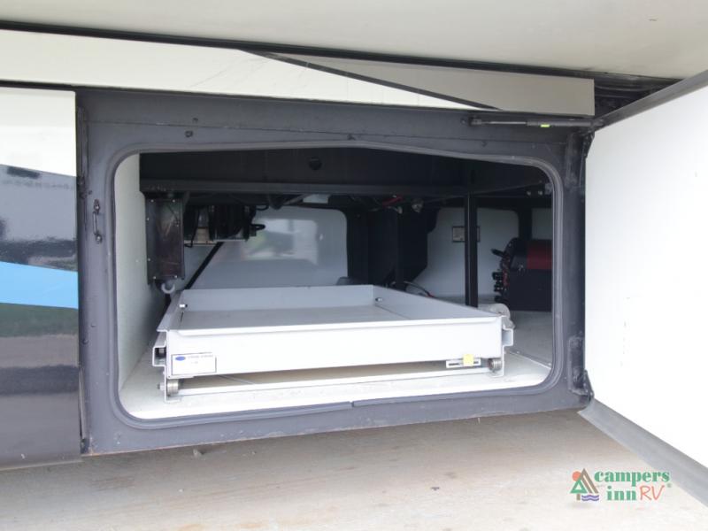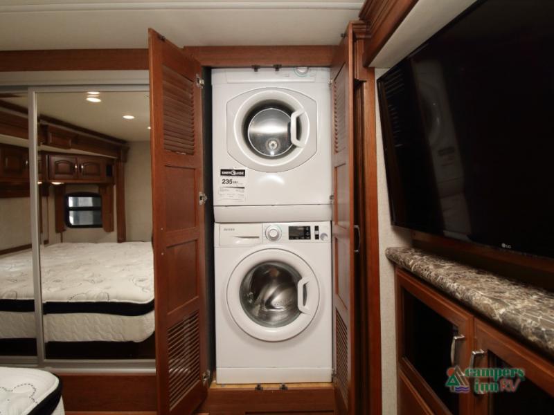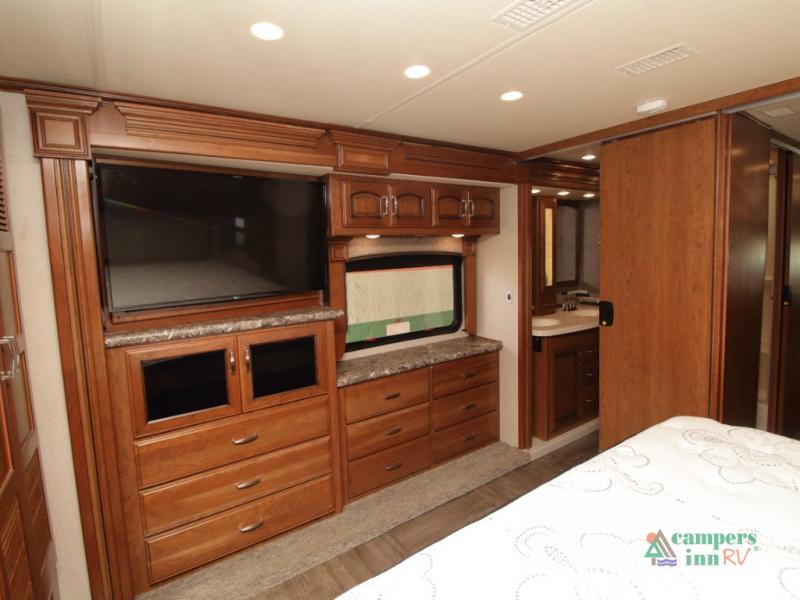 Unwind in the rear master retreat, featuring a king Serenity Series bed on its own slide-out, dual nightstands, and overhead storage. Along the rear wall, a full-length wardrobe and stackable washer and dryer simplify extended travel. Across from the bed, you’ll find a 43" LED TV and dresser—all part of a full-wall slide that includes the bathroom vanity for a truly integrated space.