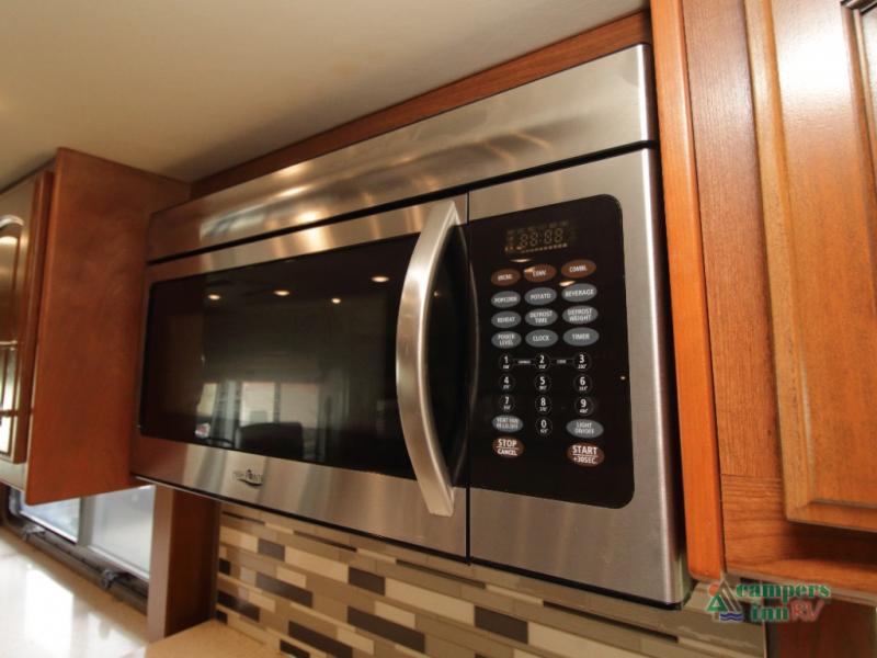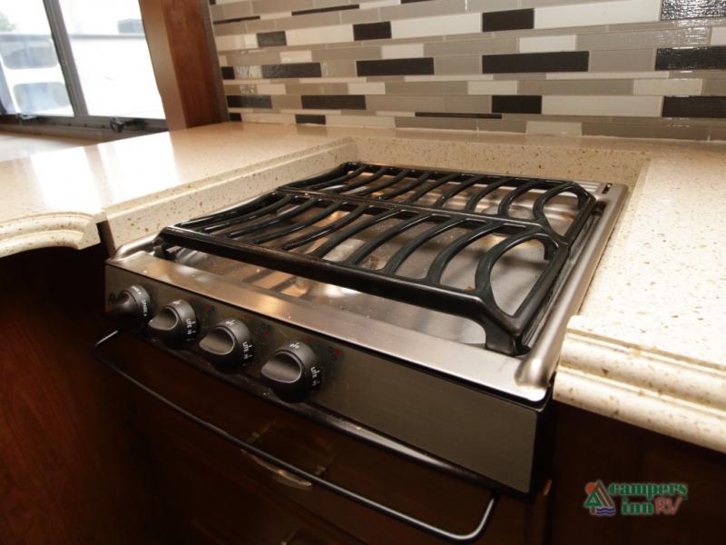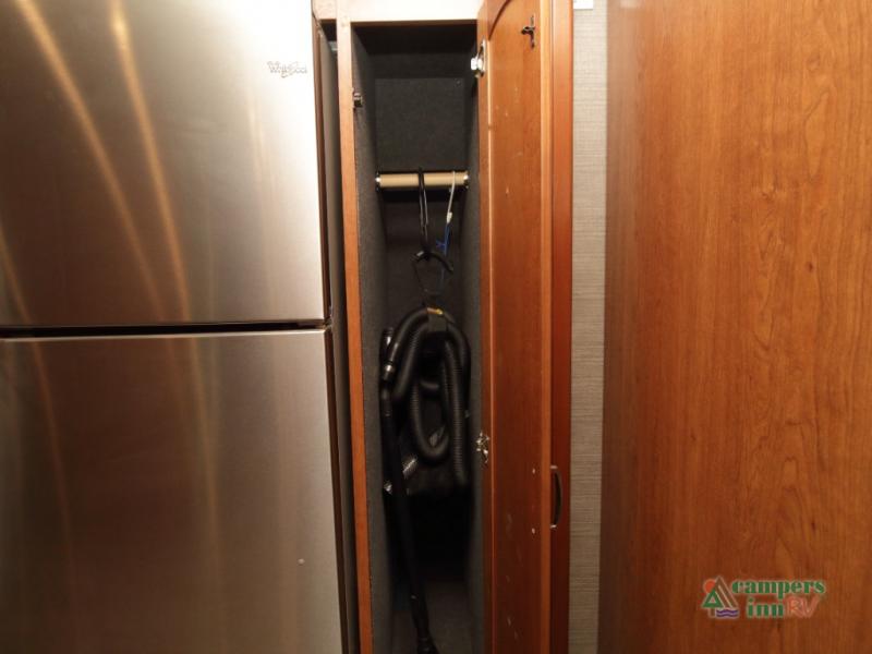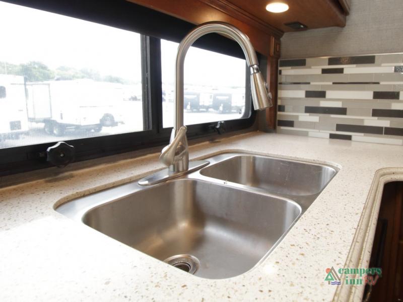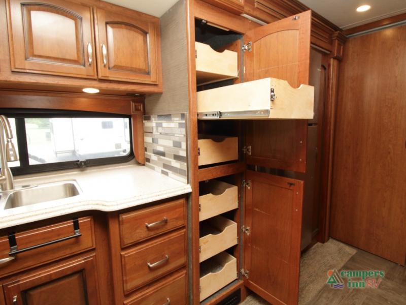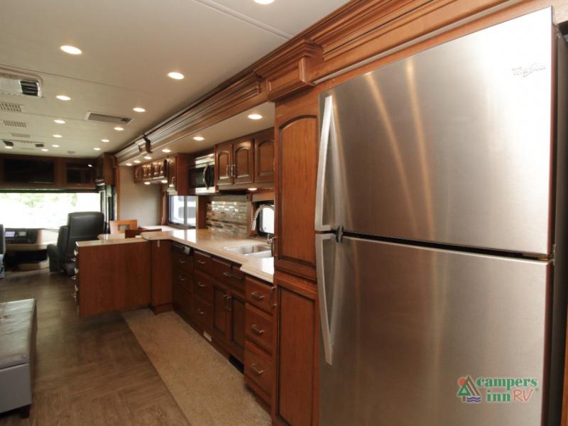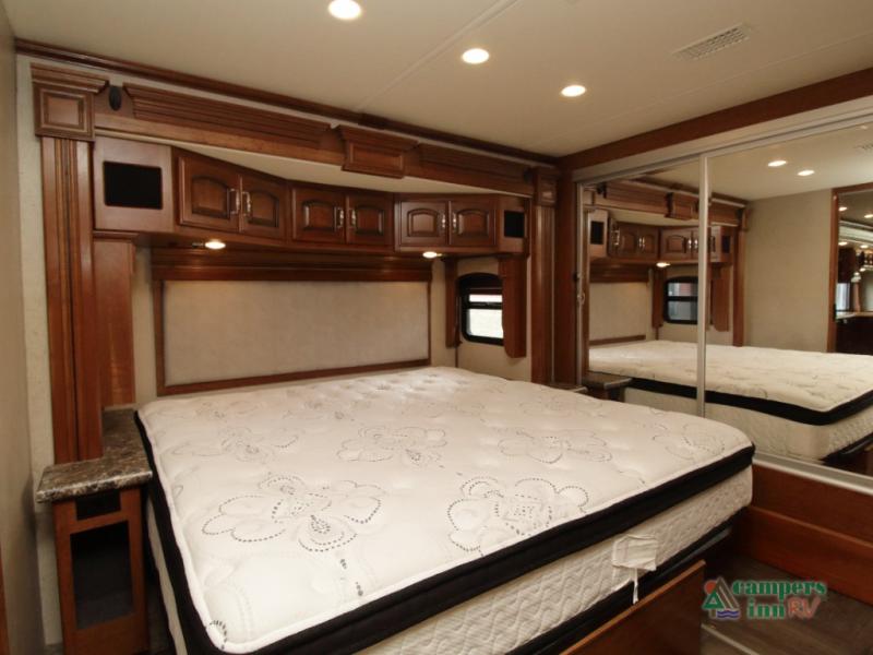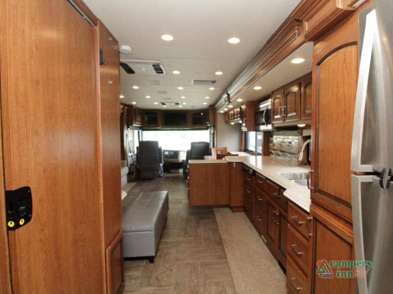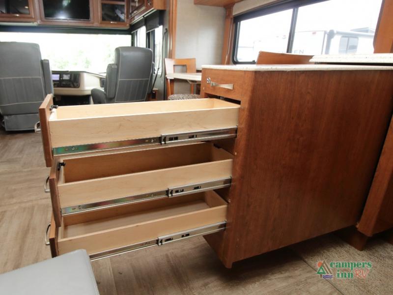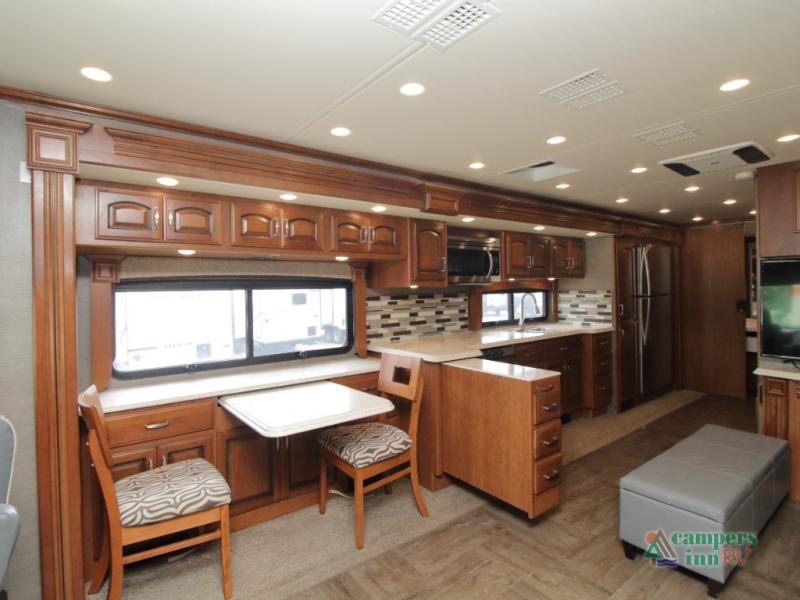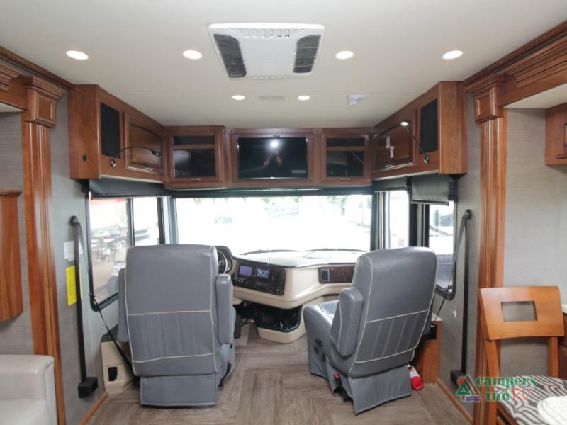Enter the coach just ahead of the passenger seat and enjoy a panoramic view of the open interior. The swivel captain’s chairs convert into extra seating, perfect for socializing when parked. A large curbside slide-out includes a 74" x 44" dinette, expansive kitchen counter space, three-burner pull-out range, convection microwave, sink, pantry, residential refrigerator, and broom closet—all framed with overhead cabinetry for your essentials.