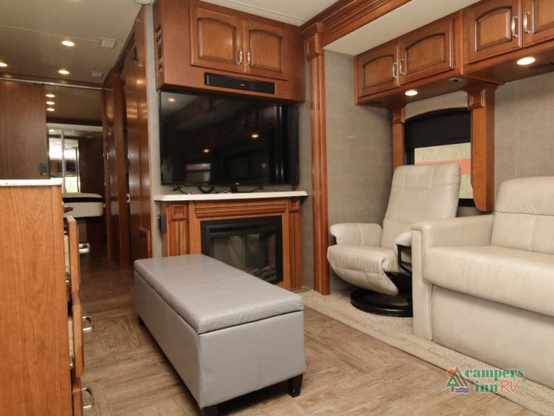 Opposite the kitchen, a lounge chair and expansive 95" x 70" L-shaped sofa offer ample seating and convert into sleeping space at night. A 49" LED TV with a built-in fireplace below completes the cozy ambiance, providing entertainment and warmth on cooler nights.