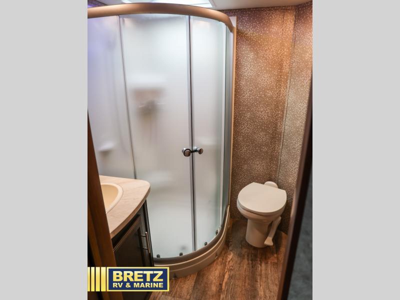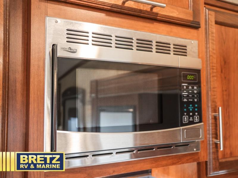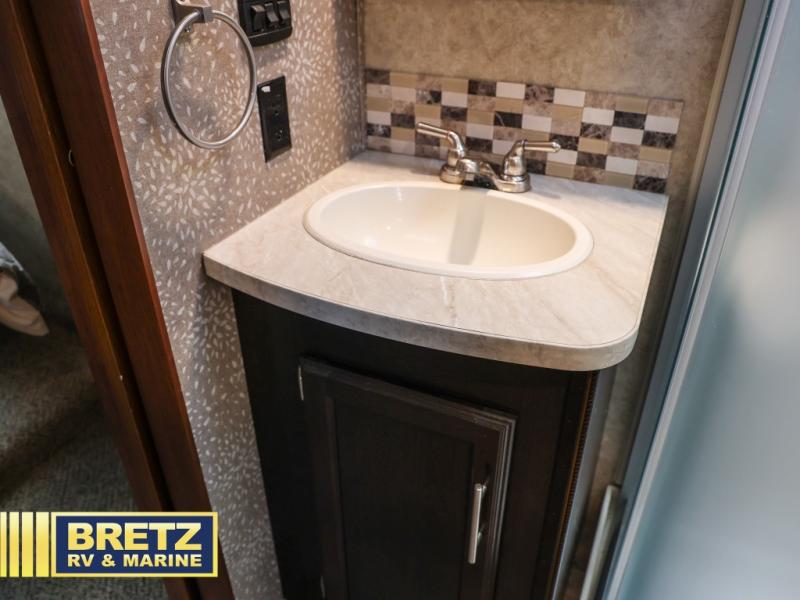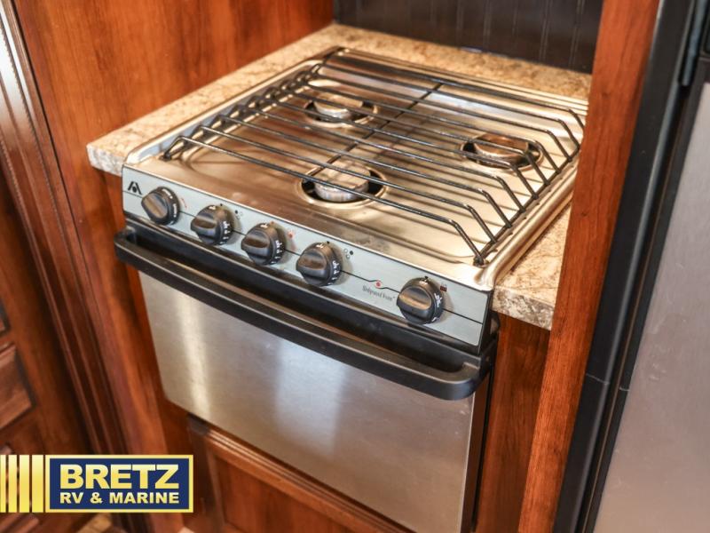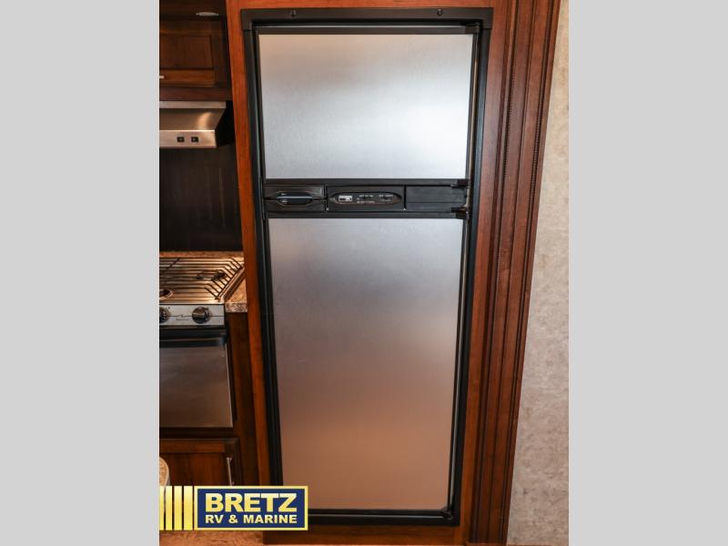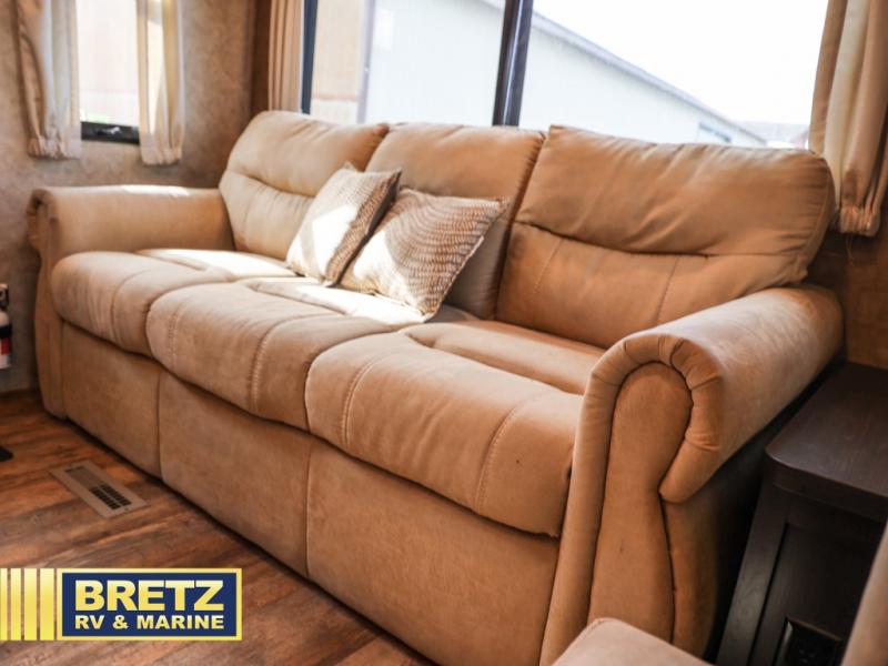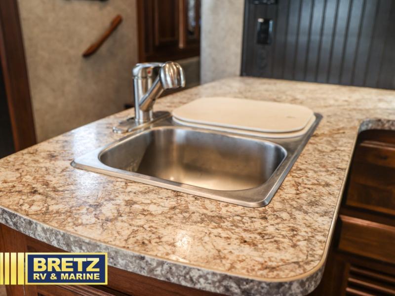 Along the rear wall there is a tri-fold sofa with two end tables and an overhead cabinet. This sofa easily converts into additional sleeping space for your kids, or any overnight guests you may have. Along the road side the slide out features a L-shaped dinette with a table, and a corner entertainment center. To the right of the door there is another slide out with a 8 cu. ft. refrigerator, a three burner range, and a microwave. The L-shaped counter is a perfect place for meal prep, plus you will also find a double sink and plenty of overhead cabinets here.