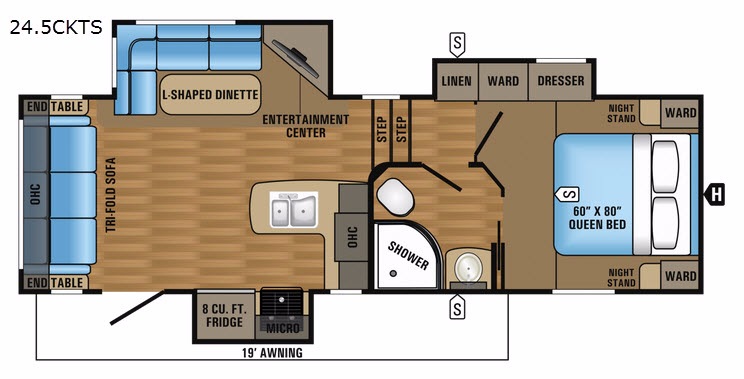 Outside there is storage areas for your extra camping gear as well as a 19' awning which helps to create more outdoor living space, and more!