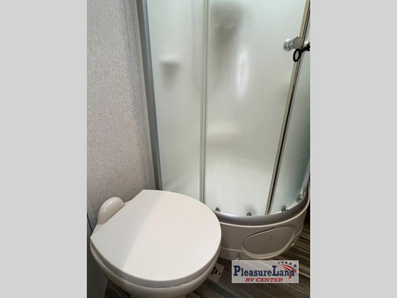 As you enter the main entrance to your left along the rear wall you will find two lounge chairs and an end table. The road side slide has a sofa and a dinette or you can choose an optional hide-a-bed sofa and a free-standing table and chairs. Along the opposite side of the trailer you will find a double kitchen sink, three burner range, microwave, refrigerator, and a pantry. Adjacent to the pantry, along the interior wall is where you will find the entertainment center.