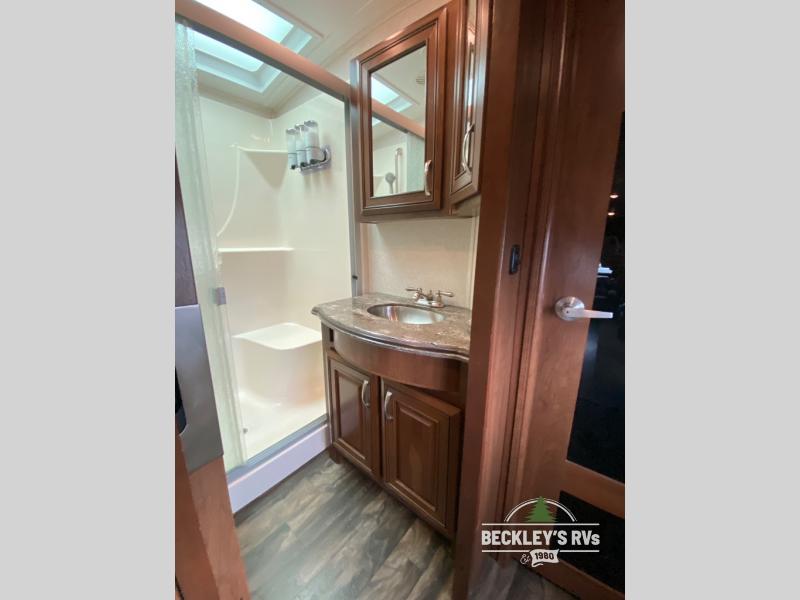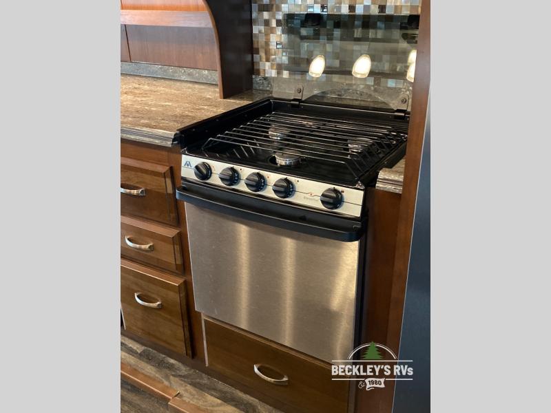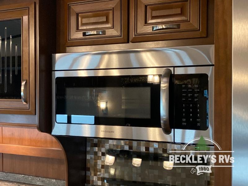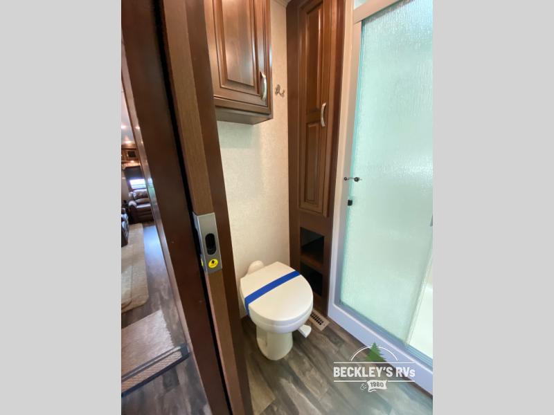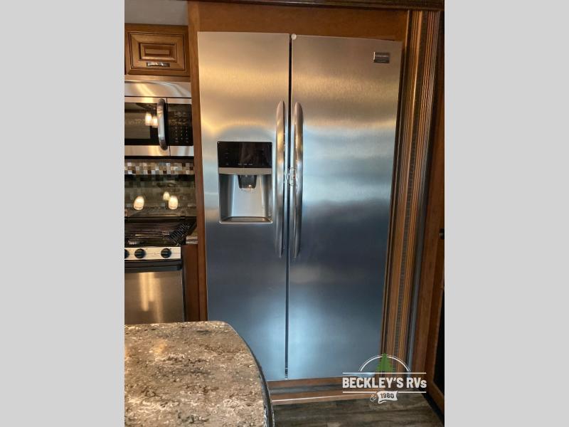 As you enter the fifth wheel, to the left there is a slide out with a free-standing table and theater seating or you can choose optional recliners. Along the rear wall you will enjoy a tri-fold hide-a-bed or choose an optional reclining sofa. The slide out along the road side has an entertainment center with fireplace below, cabinets, microwave, three burner range, and a residential refrigerator. There is a kitchen island with lots of counter space and a double kitchen sink. On the interior wall of the kitchen there is a large pantry with sliding doors and a wardrobe.