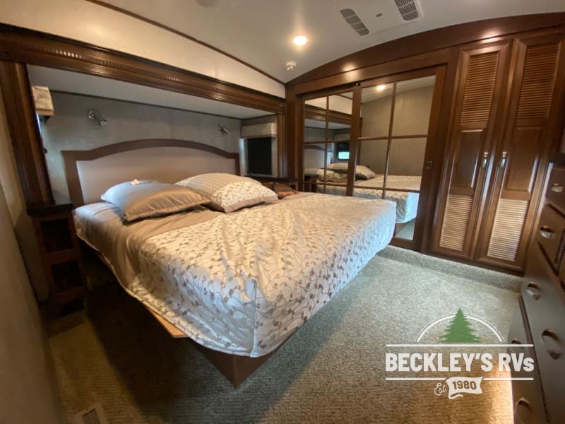 The bedroom has a king bed slide out with shelves or you can choose an optional queen with chests on either side of the bed. Enjoy the storage underneath the bed, plus all of the room in the walk-in closet. In the corner of the room there is an area that has been prepped for a washer/dryer, and across from the bed there is a chest with a TV.