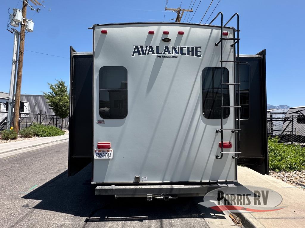 With triple slides, a rear entertainment center with fireplace, and a front bedroom, you will find that this Avalanche fifth wheel 300RE by Keystone RV has all the comforts of home!