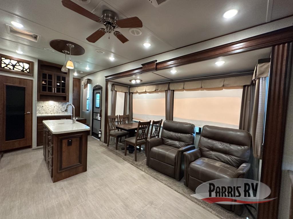 Step inside this model and imagine your next camping trip going up a notch. The spaciousness makes you feel as though you are still at home. Just inside the door to your left there is a slide out free-standing table with four chairs and two lounge chairs. On the opposite side of the fifth wheel you will find that the opposing slide has a tri-fold sofa sleeper, an 18 cu. ft. refrigerator, three burner range, residential microwave, and overhead cabinet for dishes. In the middle of the kitchen you will find an island with a double sink. There is also a pantry near by, and a curio cabinet.
