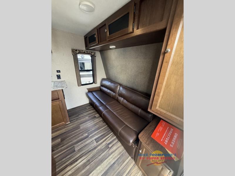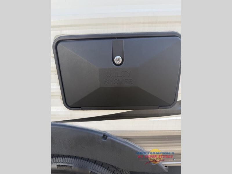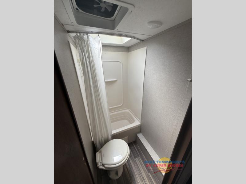 The rear left corner features a double bed with single flip-up bunk above including storage. The opposite rear corner offers a private shower and toilet room, with a separate sink just outside the bath door, and so much more!
