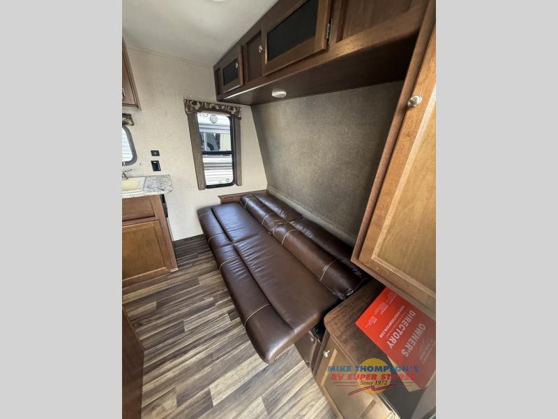 To the left of the door there is a booth dinette with overhead storage, and a second closet for clothing storage.