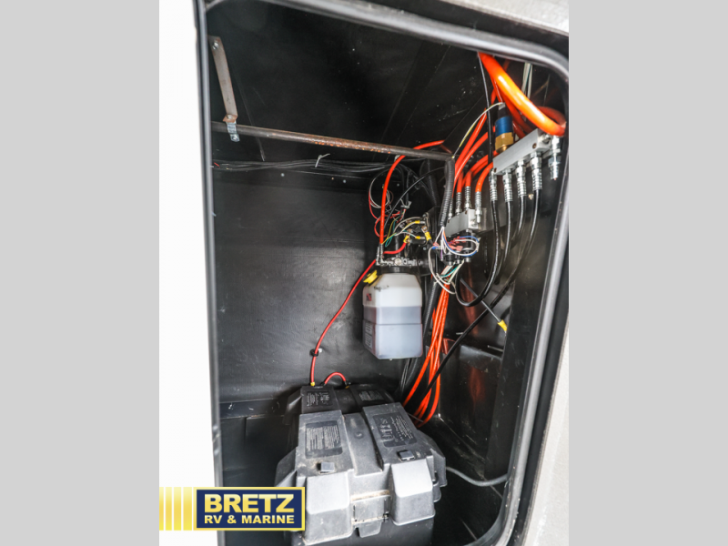 At the end of the hall through the door enjoy a spacious front bedroom retreat. Inside find a slide out queen or optional king size bed with storage underneath. There is also a dresser with HD TV above, and closet along the front wall with a washer and dryer prepped space in the corner.