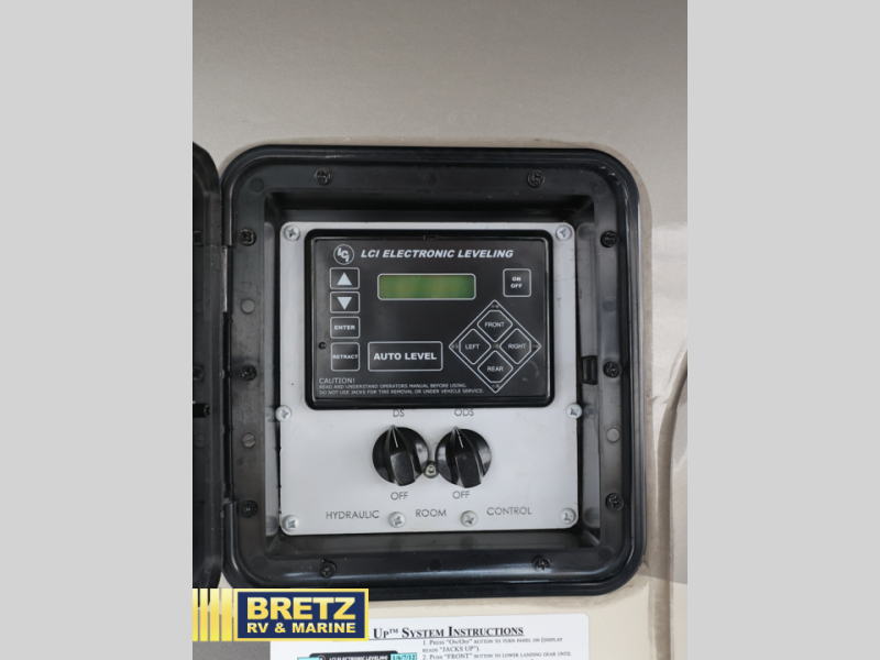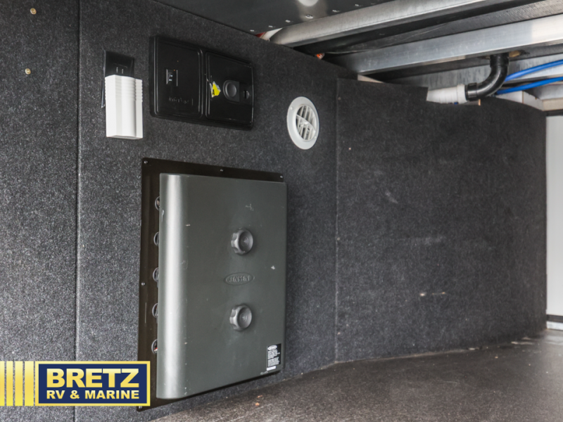 Head toward the rear and step up to find a raised living area with dual opposing slides featuring a hide-a-bed sofa in each. There are also theater seats for added seating, making this space the perfect conversation area. Enjoy watching television on the flat screen TV along the rear wall, and choose the optional fireplace shown in the floor plan image for those cool chilly nights when you just want to stay inside.