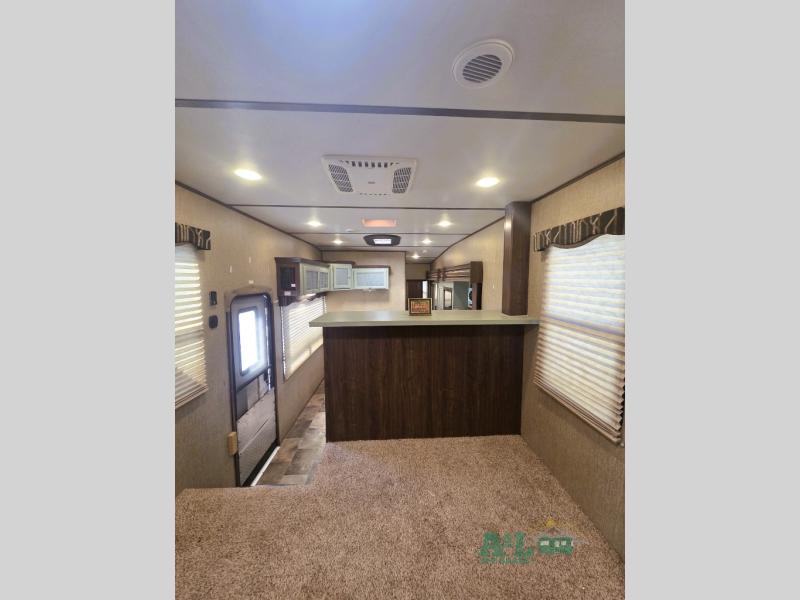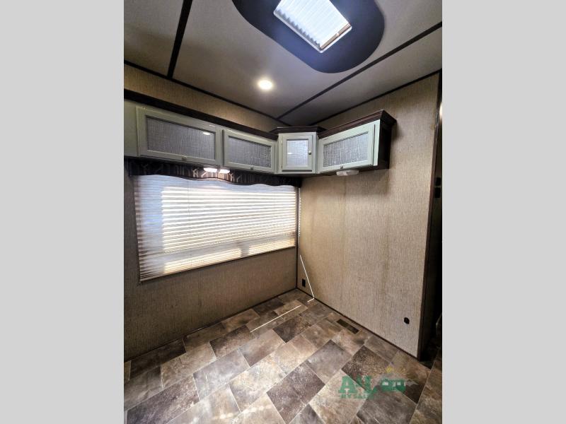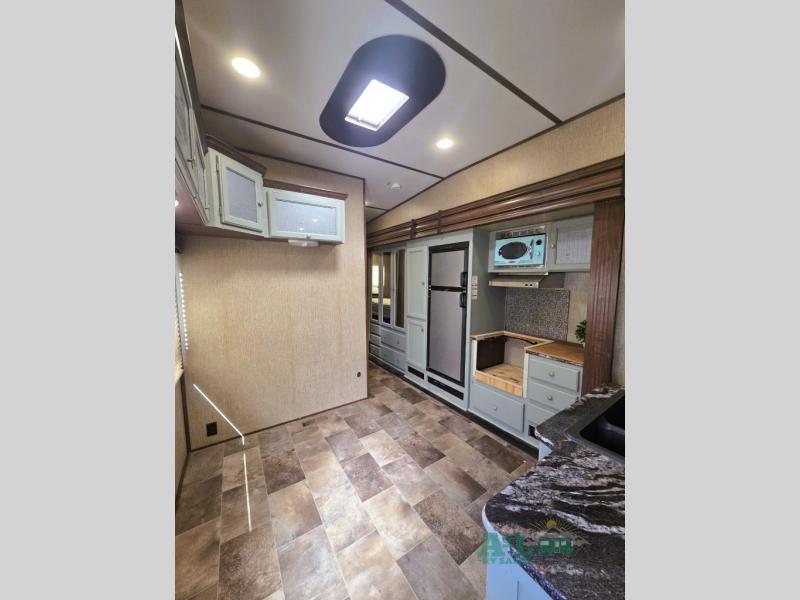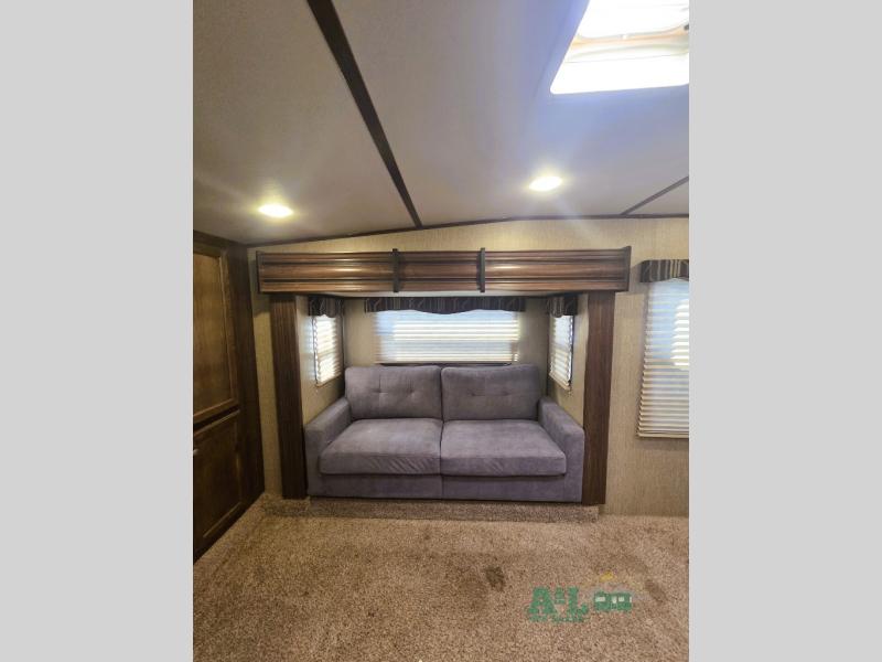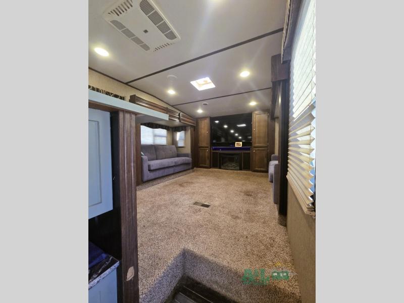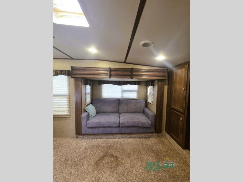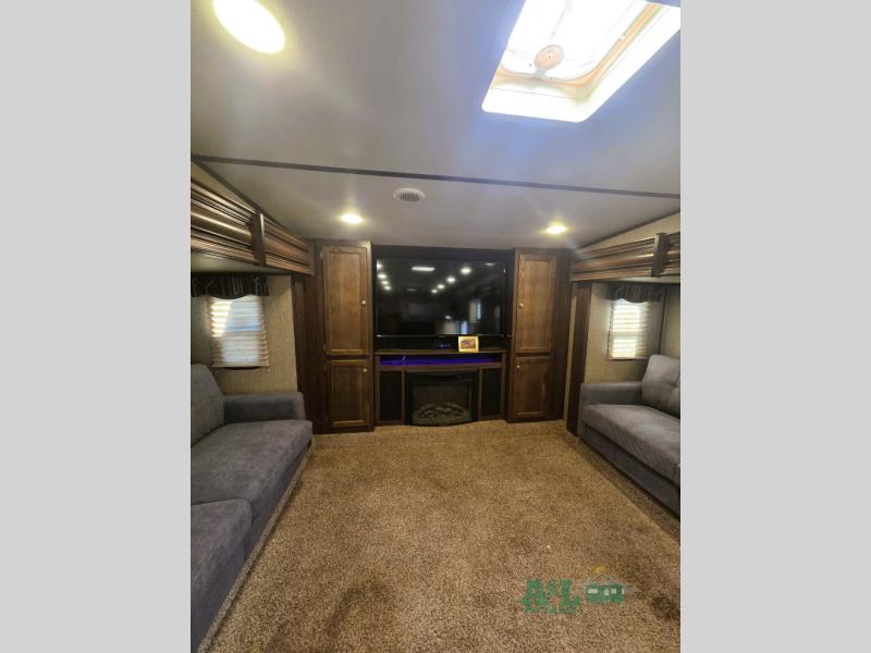 Head up the steps towards the front of the fifth wheel to a raised living area which is perfect for entertaining guests. There is theater seating, dual slide out tri-fold sleeper sofas, and a front wall entertainment center with 40" TV including a fireplace below. You will also find plenty of floor space for the kids to sprawl out and enjoy a family movie, plus so much more!