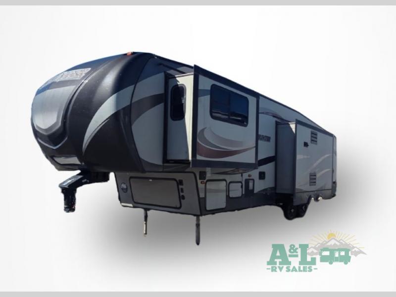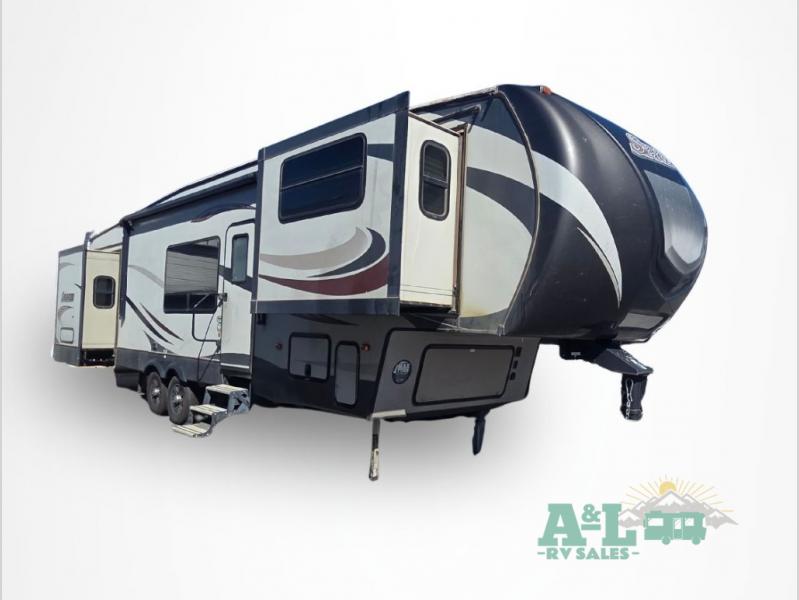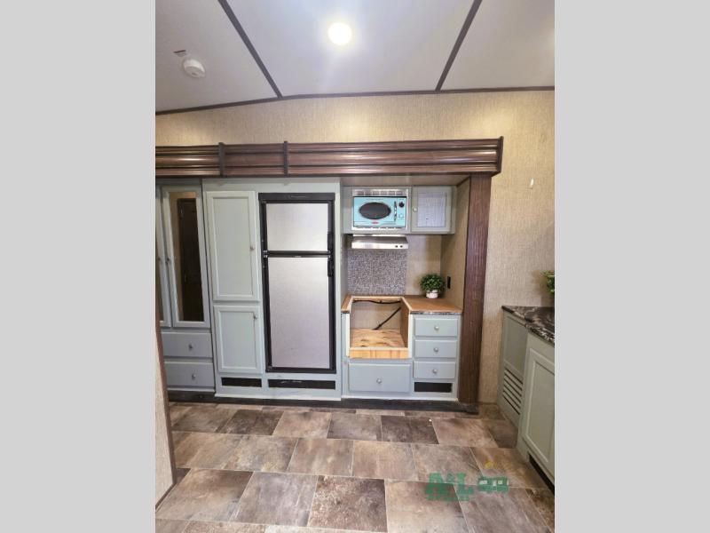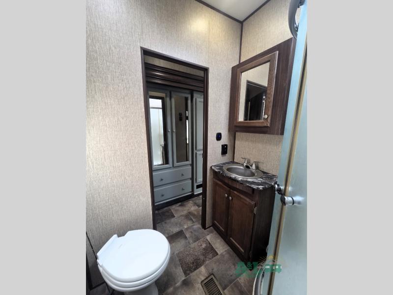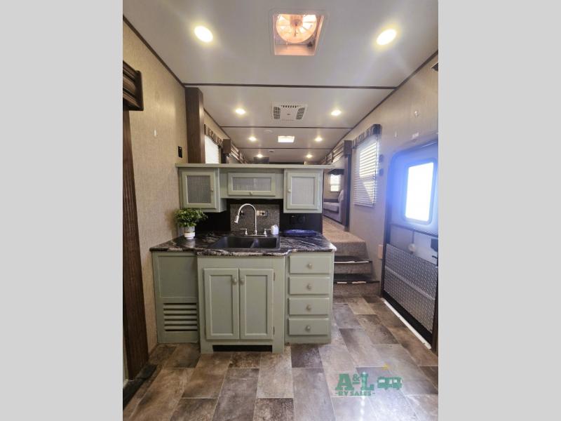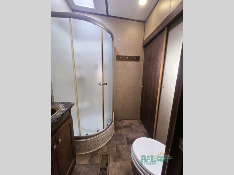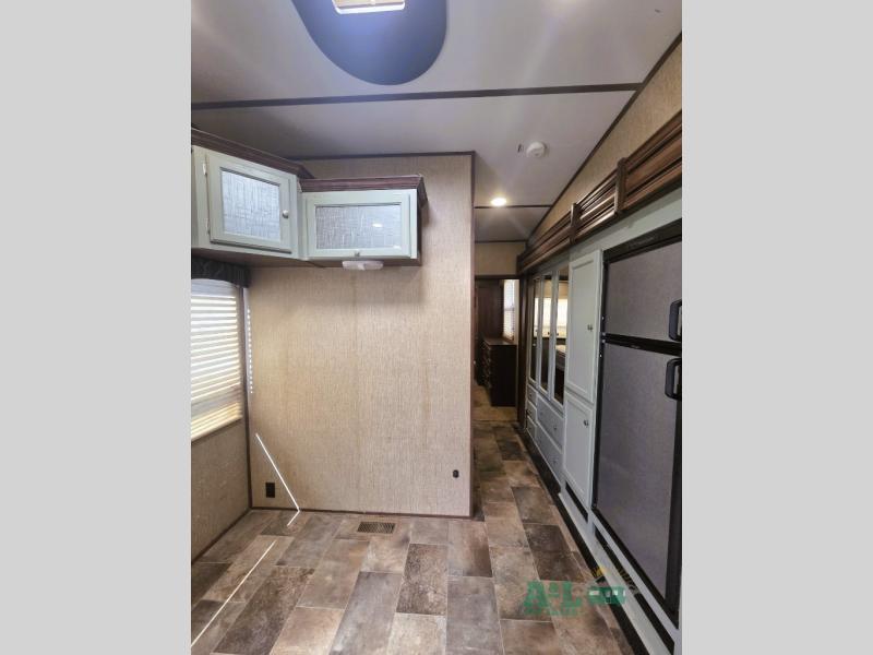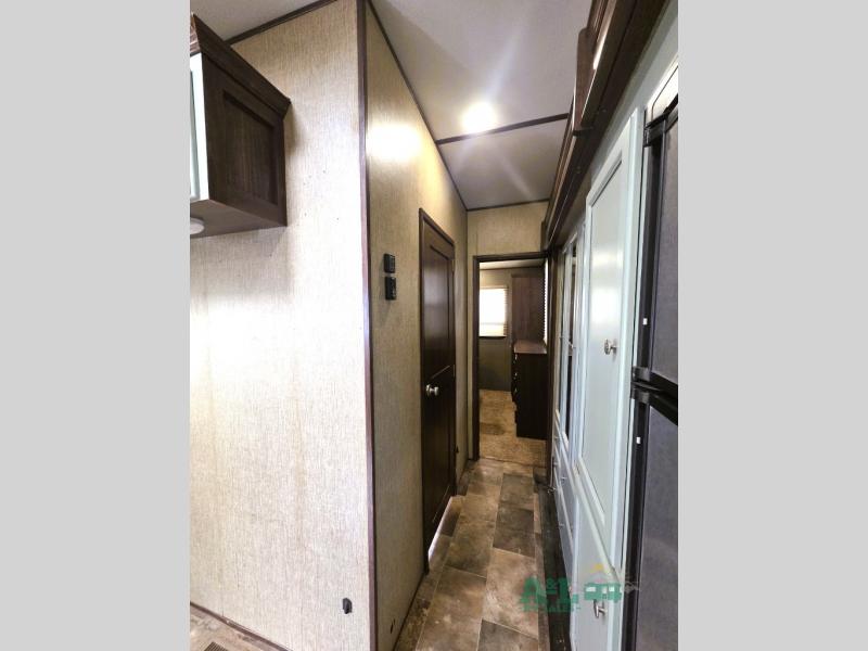 Head up the steps towards the front of the fifth wheel to a raised living area which is perfect for entertaining guests. There is theater seating, dual slide out tri-fold sleeper sofas, and a front wall entertainment center with 40" TV including a fireplace below. You will also find plenty of floor space for the kids to sprawl out and enjoy a family movie, plus so much more!