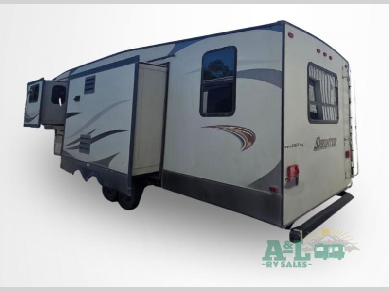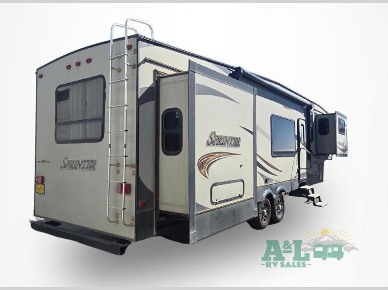 A spacious front living room including a fireplace along with quadruple slides make this Sprinter fifth wheel model 334FWFLS by Keystone RV unique!